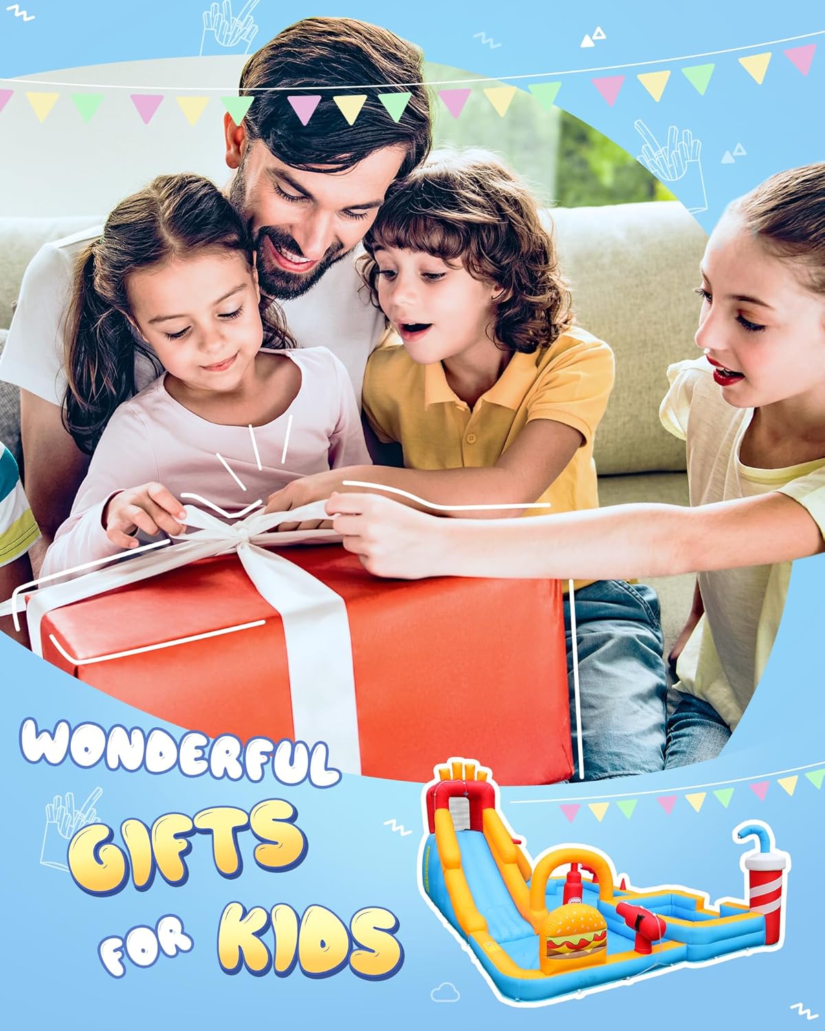 - 【Exciting Playtime with Friends】- Our inflatable waterpark provide diverse activities, including an Extra-Long Water Slide, Boxing Ring, Climbing Wall, and Spacious Splash Zone. Say goodbye to solo play; keep the fun alive for multiple children and set up swiftly.