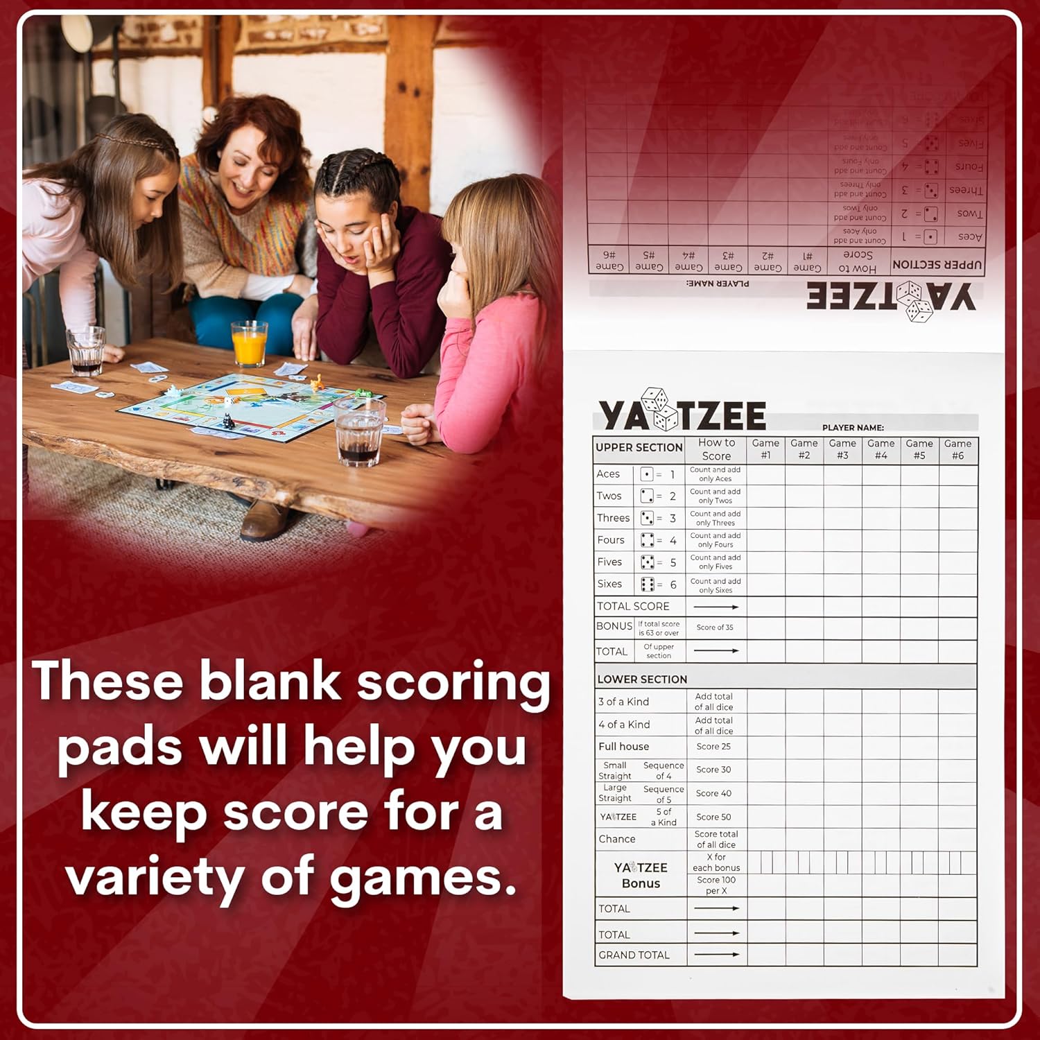 - [Customer Service]: Our product is straightforward - what you see is what you get. A durable, non-perforated Yahtzee score pad that complements your gaming without any unnecessary frills.