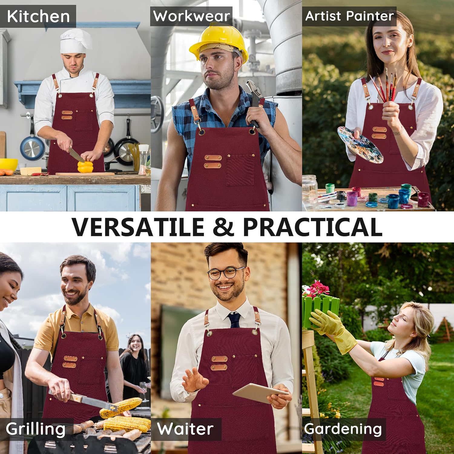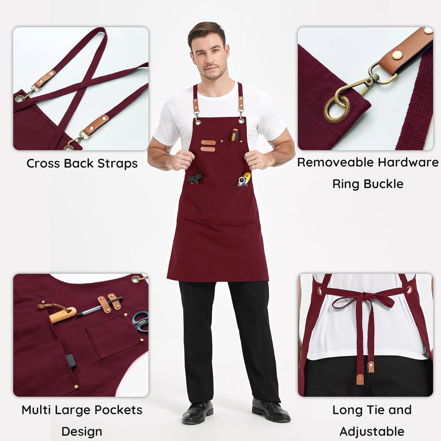 - EXCELLENT QUALITY : Cooking Aprons for Men is made of high-grade thicker canvas. Designed with brass hardware and premium microfiber leather trims. Elegant and durable.