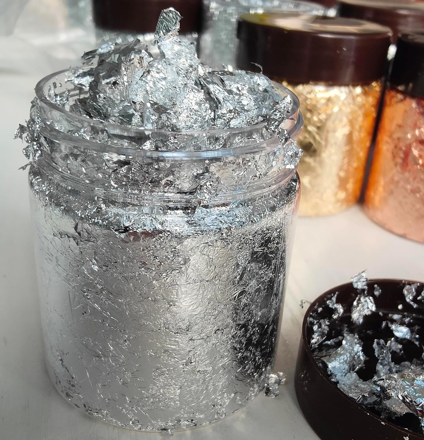 - Add a touch of luxury to your resin creations with this set of 3 bottles of gilding gold leaf flakes, imitation silver, and 100% copper flakes. The net weight of gold and copper color flakes is about 10 grams per bottle,and the silver color foils is about 3 grams per bottle.