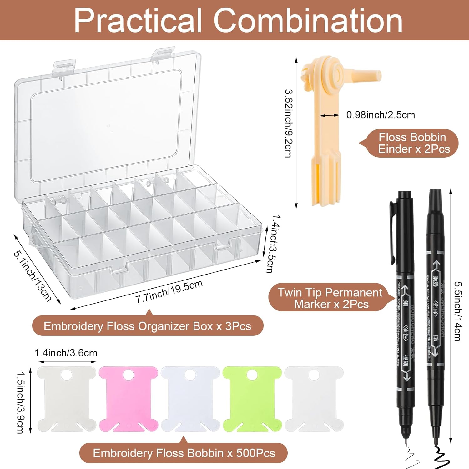 - Practical Combination: you will receive 500 pieces of embroidery floss bobbins in 5 colors, clear, white, blue, pink and green, 100 pcs of each color, 2 pcs floss bobbin winder, 3 pcs embroidery floss organizer boxes and 2 pcs twin tip permanent markers, easily meeting your daily requirements
