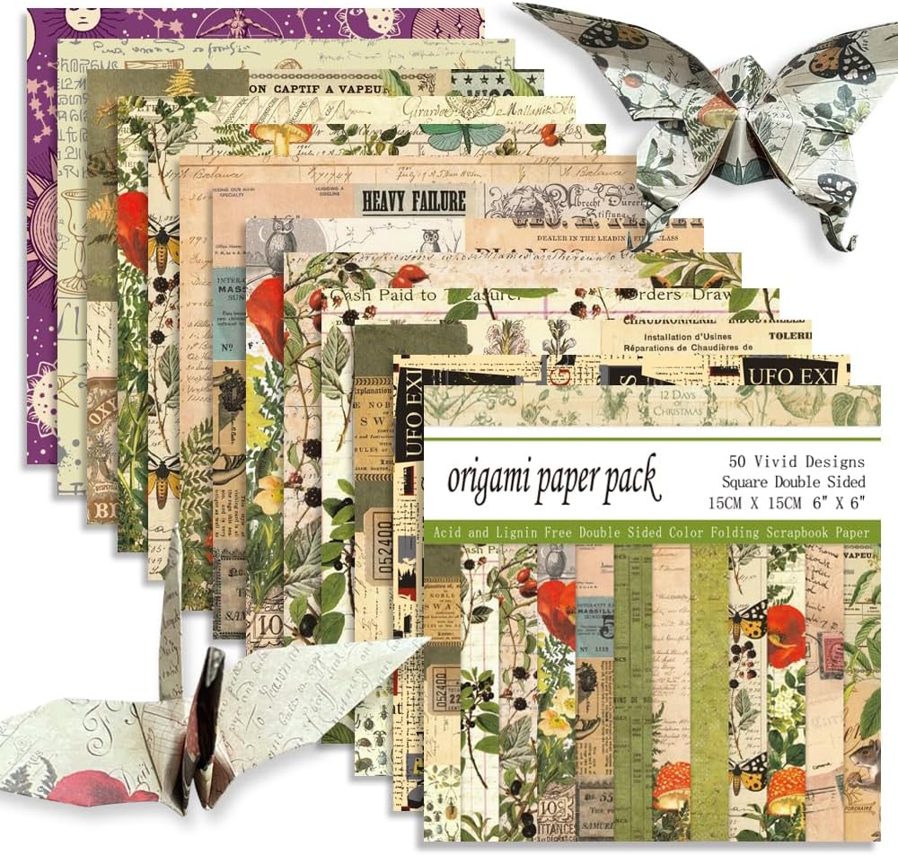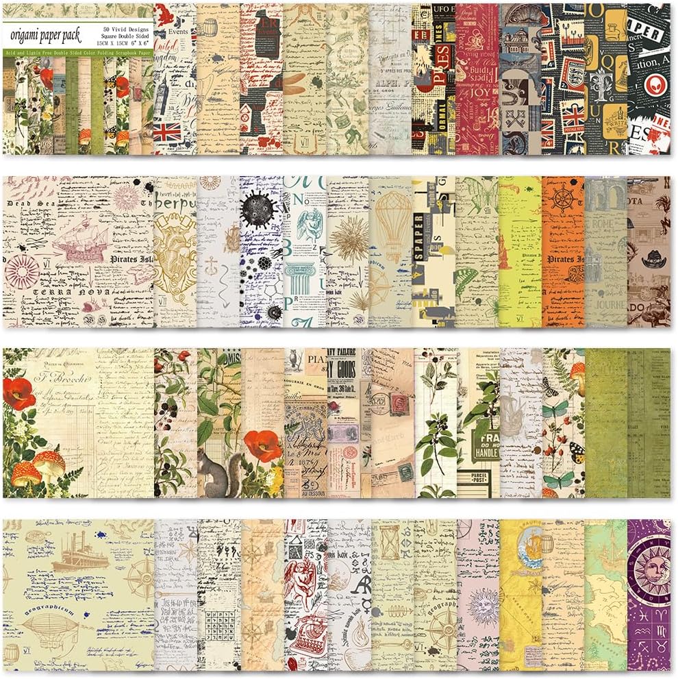 Square Origami Paper 6x6 Double Sided 50 Sheets 50 Colors 70GSM Origami Kit Japanese Chiyo Easy Fold Arts Crafts DIY Handwork Beginner Retro Newspapers