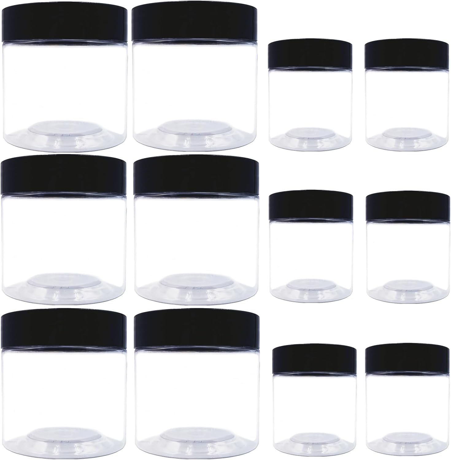 - VALUE PACK:You will get 12pcs(8 oz and 4 oz) clear plastic cosmetic jars with black lids and 12pcs labels.extra 12pcs pressure sensitive gaskets