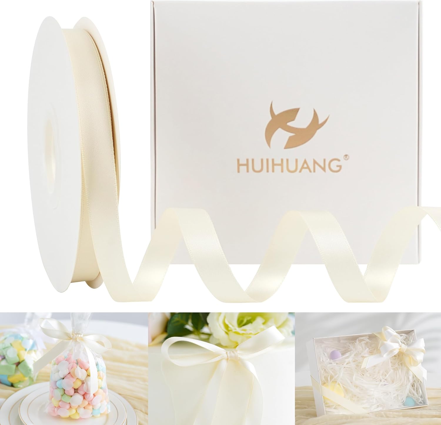 HUIHUANG Ivory Satin Ribbon 1/2 inch X 50 Yards Continuous, Off-White Double-Faced Satin Ribbon for Gift Wrapping, Bows, DIY Crafts, Flower Bouquet, Wedding Bridal Shower Decor, Flower Crowns