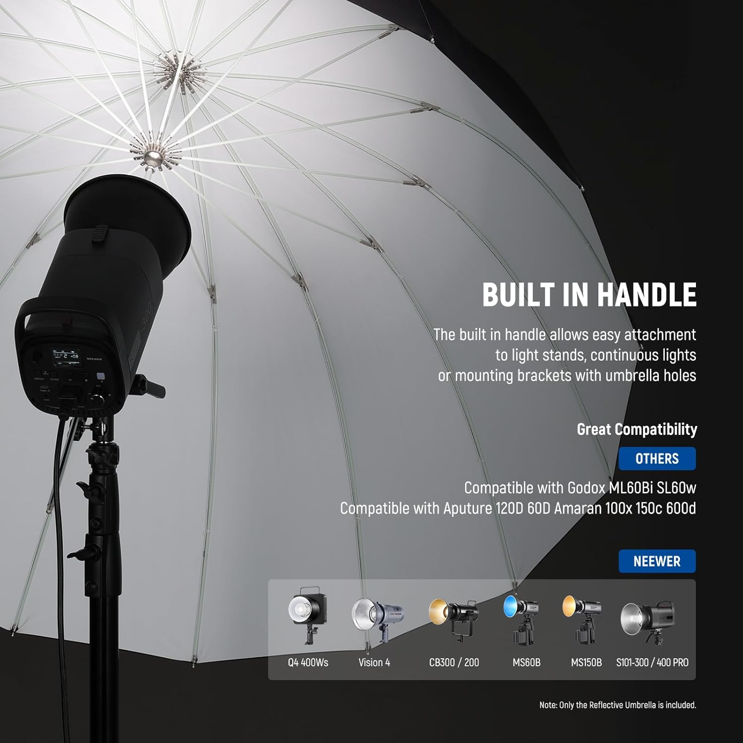 - 【51"/130cm Black/White Parabolic Reflective Umbrella】 This 51"/130cm deep parabolic umbrella softbox provides a softer and more evenly diffused light effect than the black/silver version, and preserves neutral color temperature for faithful color rendition. Perfect for group portraits or expansive landscapes. Its parabolic shapped design allow for a broader spread of light