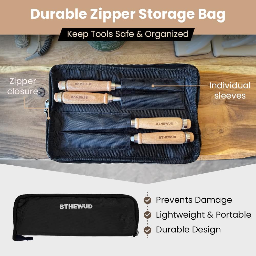 - 4 piece Chisel set with durable zipper storage bag. Protective bag with zipper, allows for tools to be stored safely in various conditions. Responsibily sourced in China.