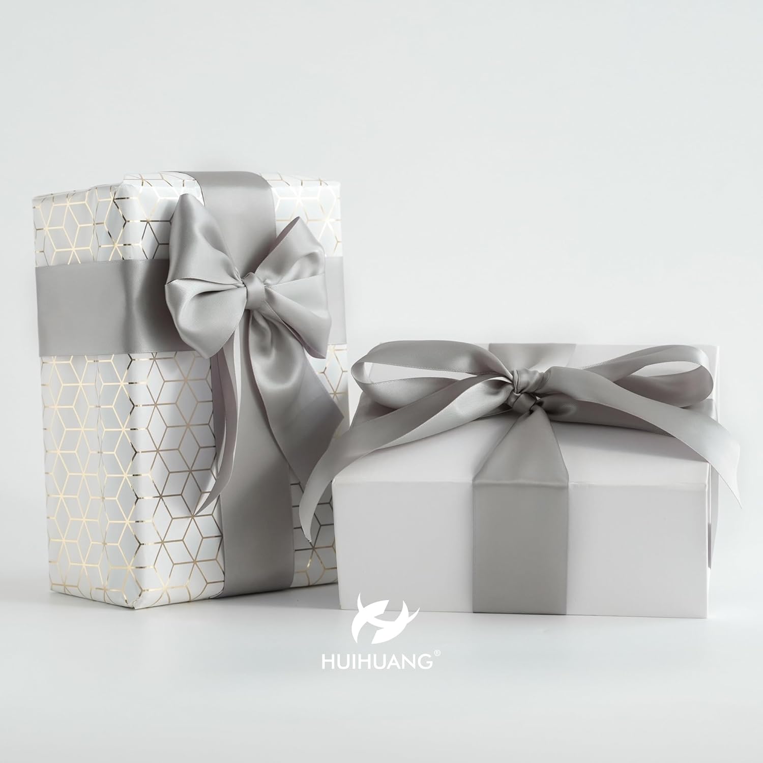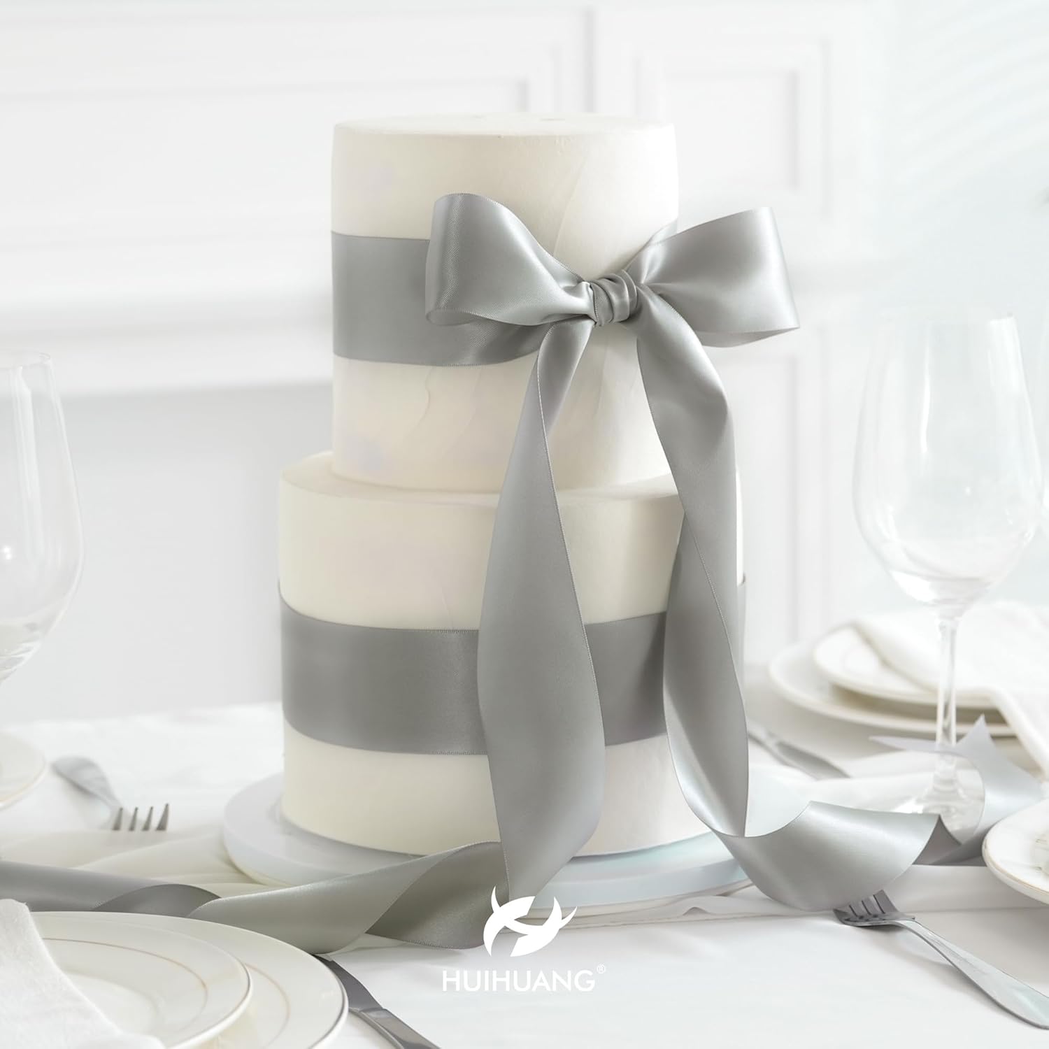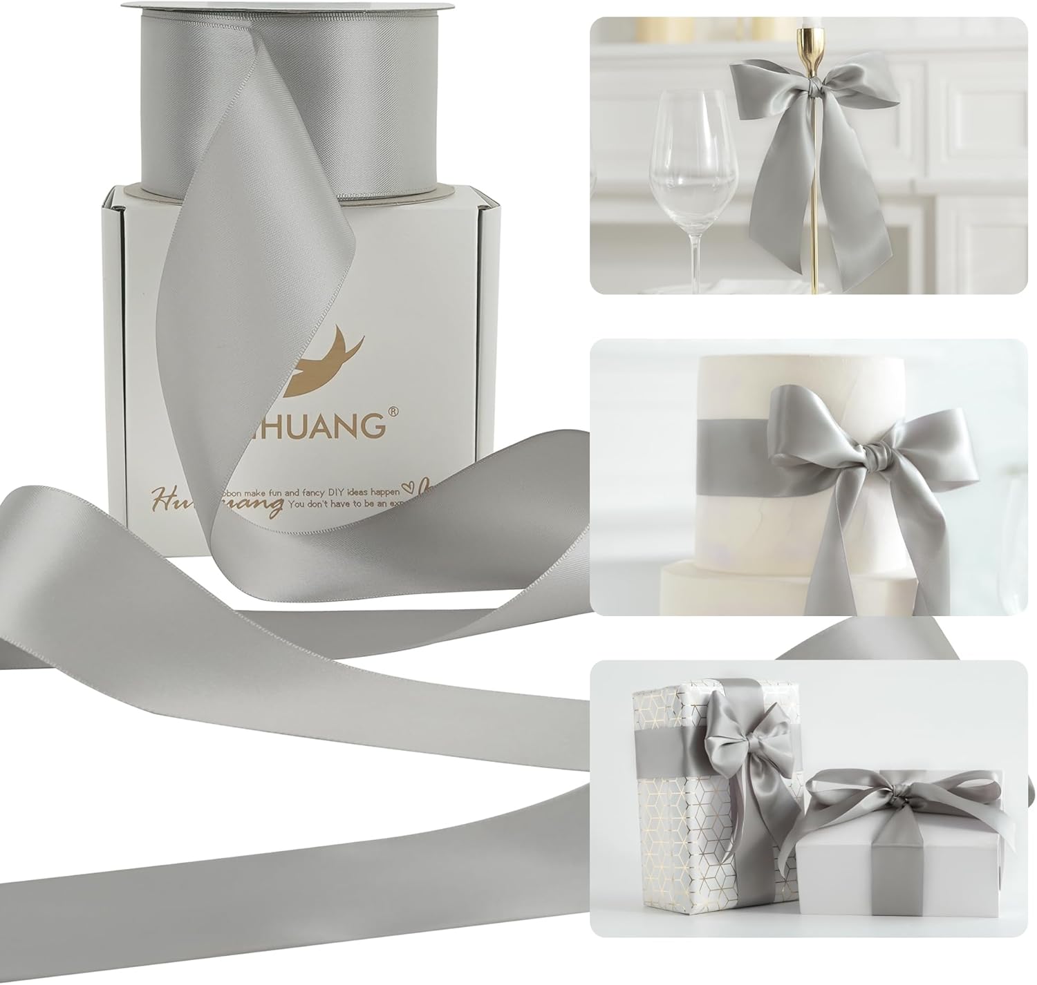 HUIHUANG Silver Satin Ribbon 2 inch Wide Double Faced Satin Ribbon Silver for Gift Wrapping, Bows Making, Flower Bouquet, DIY Crafts, Wedding, Holiday Party Decor - 25 Yards/Roll