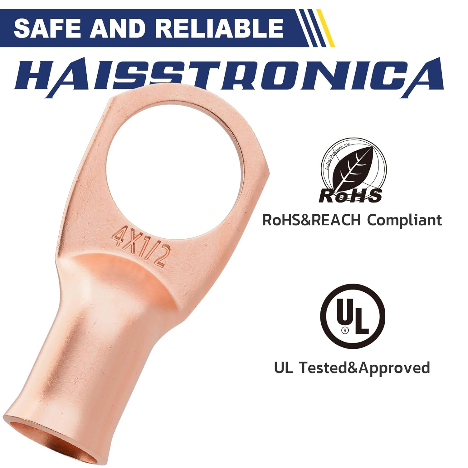 - High Quality Material: Our 4 awg ring terminals are adopted for bare annealed copper material with a special treatment surface for Corrosion & Oxidation Resistance. The 99.99% heavy duty pure copper lugs get a good transfer of electric in battery and achieve maximum current flow, effectively preventing short circuits and poor contact. 3:1 ratio heat shrink tube made of polyolefin material, which is non-toxic, temperature up to 257°F and flame-retardant, ensuring secure use and adherent