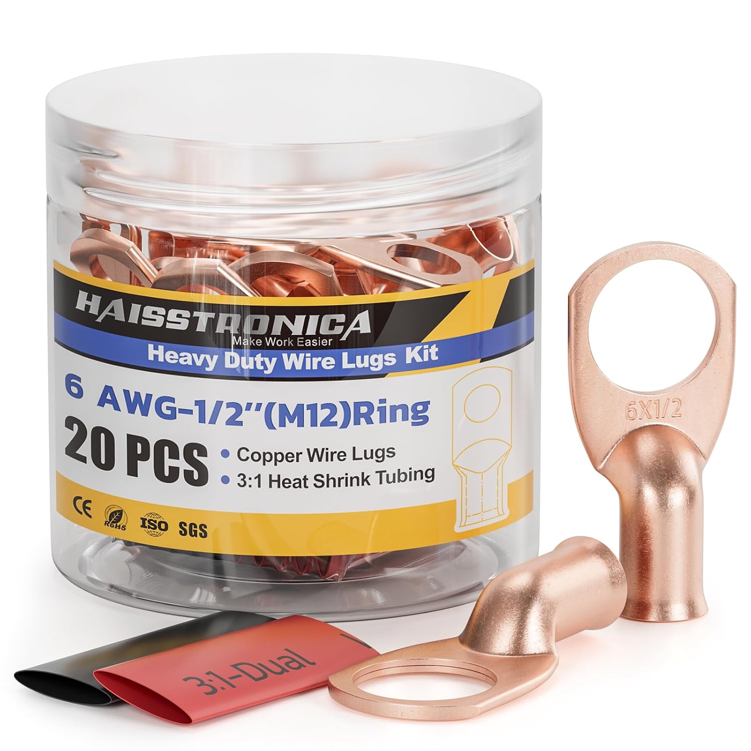 - Copper Lugs and Heat Shrink Tubing Kit: 10 PCS 6 gauge (AWG) - 1/2" (M12)ring terminals copper wire lugs and 10 PCS 3:1 Dual Wall Adhesive Heat Shrink Tubing(5 black and 5 red), and comes with a sturdy clear plastic jar that make battery cable ends easy storage