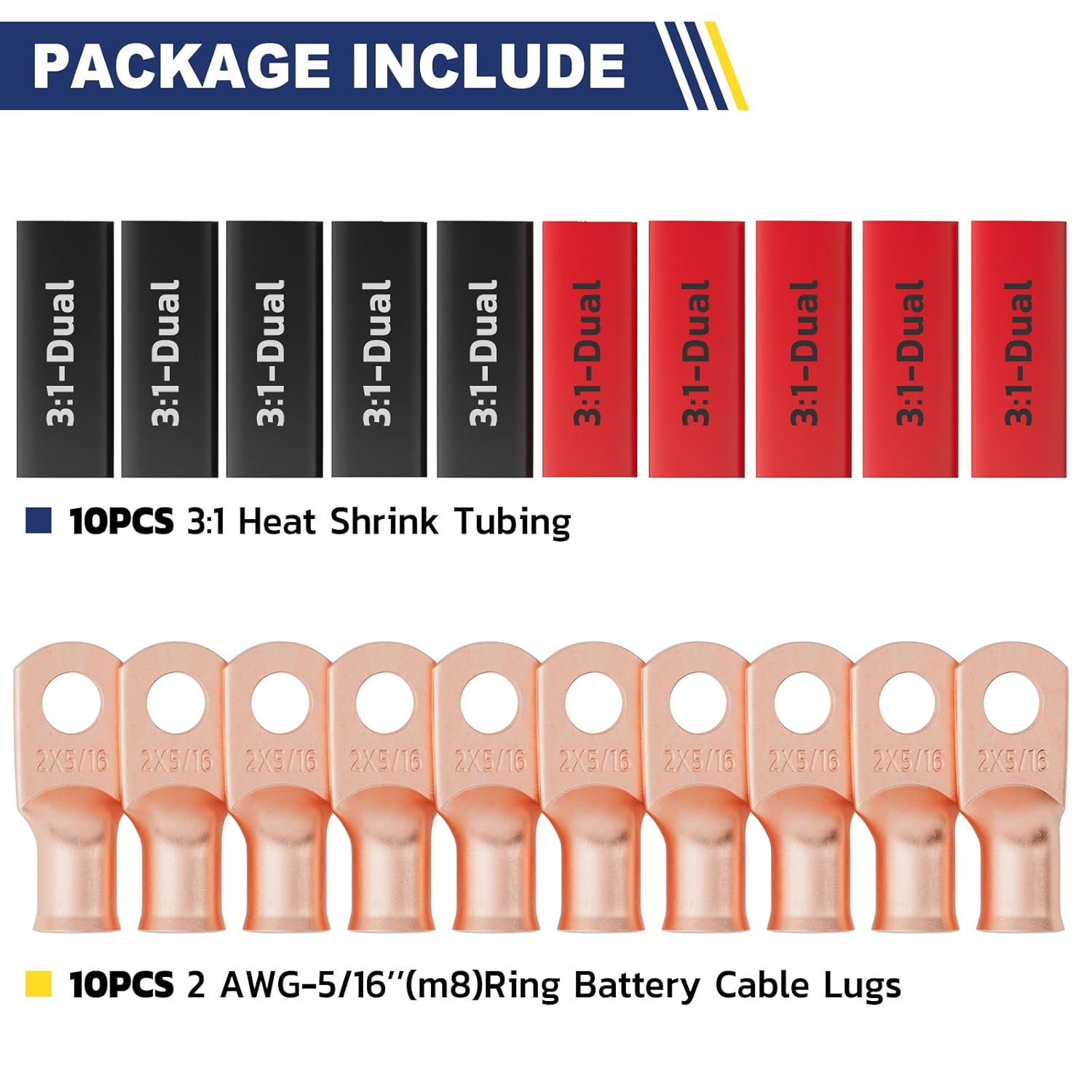 - Copper Lugs and Heat Shrink Tubing Kit: 10 PCS 2 gauge (AWG) - 5/16" (M8)ring terminals copper wire lugs and 10 PCS 3:1 Dual Wall Adhesive Heat Shrink Tubing(5 black and 5 red), and comes with a sturdy clear plastic jar that make battery cable ends easy storage.