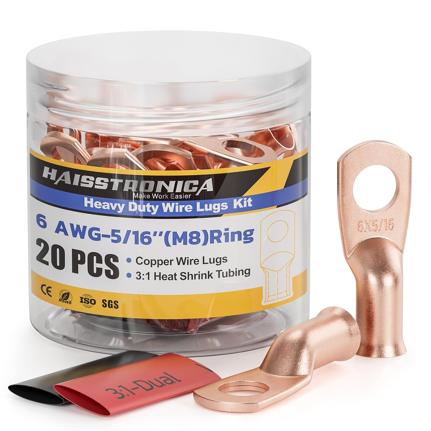 - Copper Lugs and Heat Shrink Tubing Kit: 10 PCS 6 gauge (AWG) - 5/16" (M8)ring terminals copper wire lugs and 10 PCS 3:1 Dual Wall Adhesive Heat Shrink Tubing(5 black and 5 red), and comes with a sturdy clear plastic jar that make battery cable ends easy storage