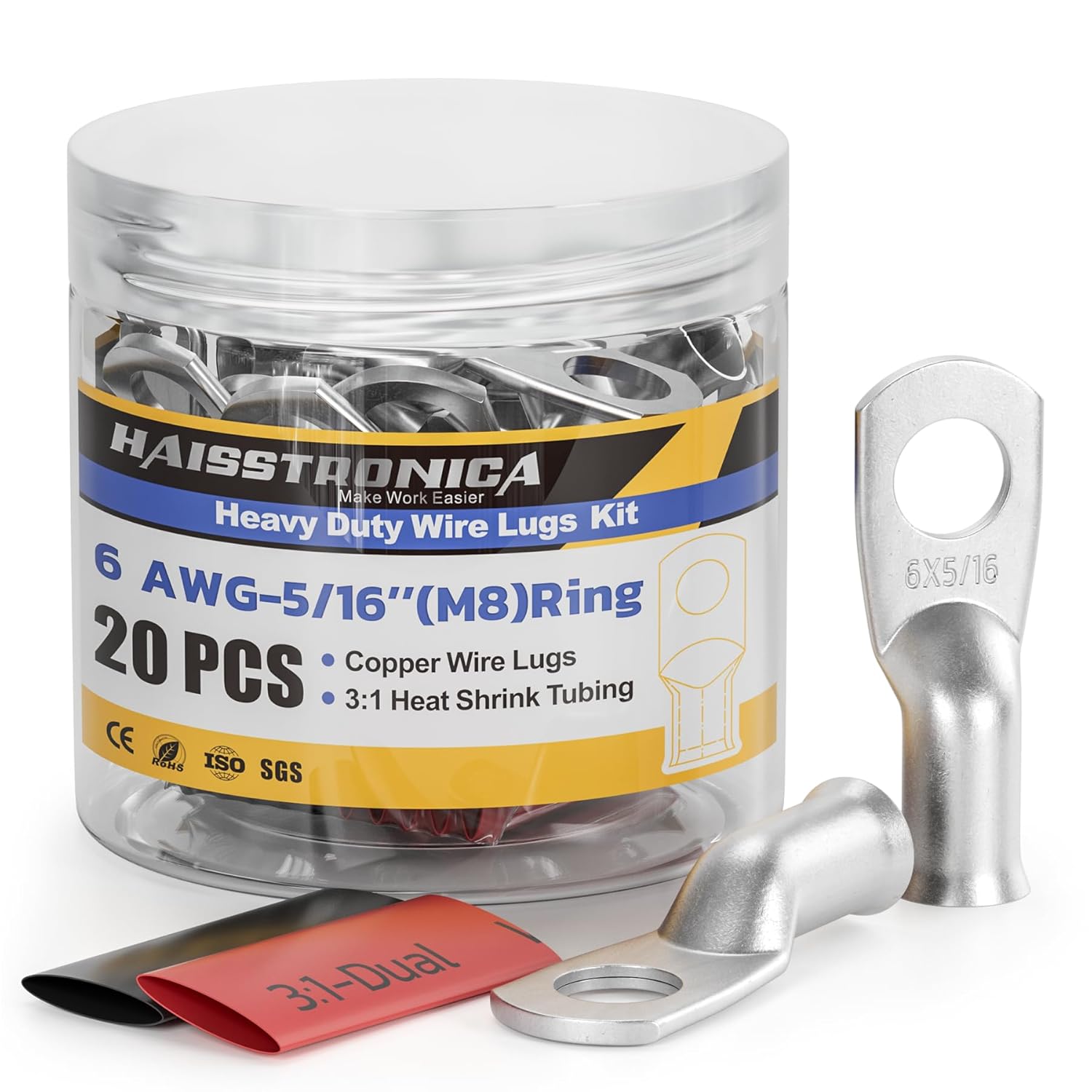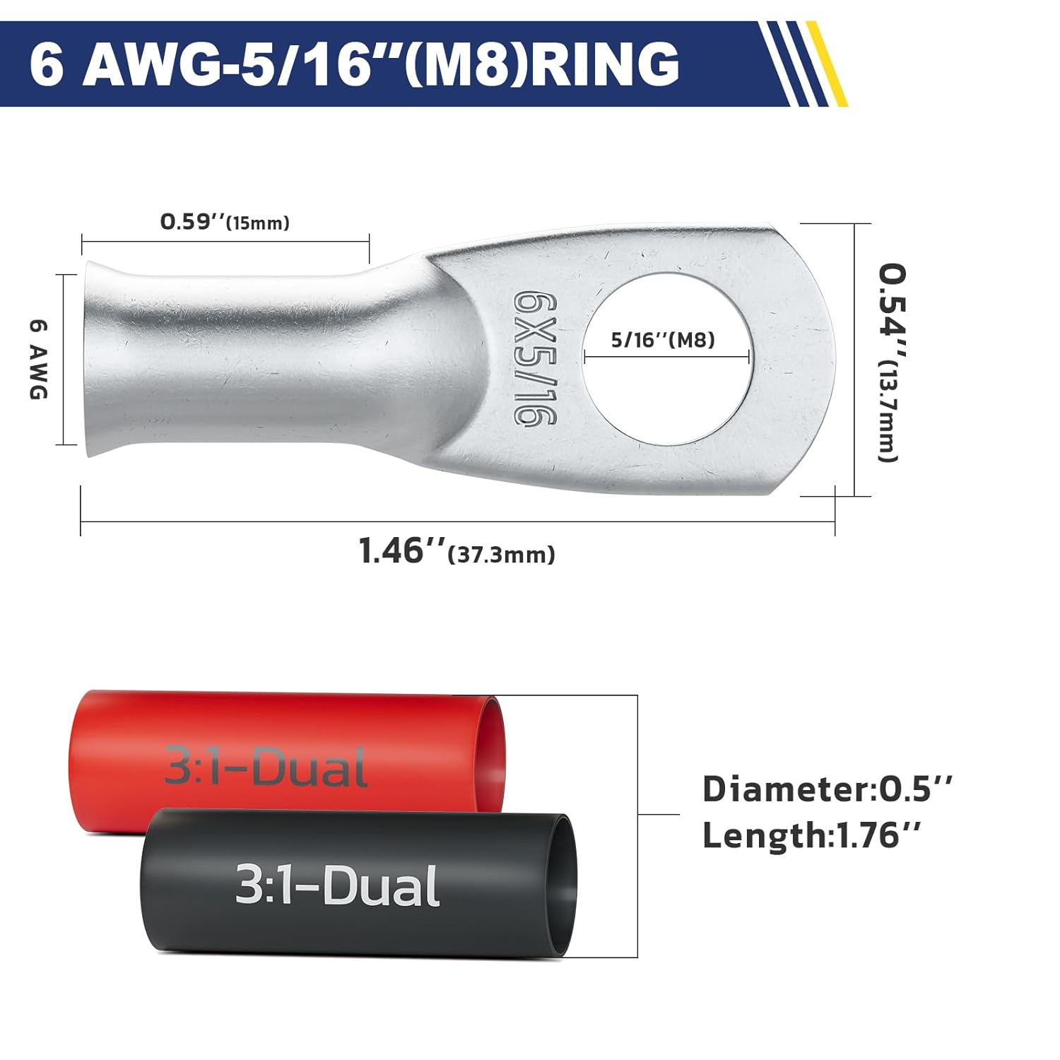 - Tinned Copper Lugs and Heat Shrink Tubing Kit: 10 PCS 6 gauge (AWG) - 5/16" (M8)ring terminals tinned copper wire lugs and 10 PCS 3:1 Dual Wall Adhesive Heat Shrink Tubing(5 black and 5 red), and comes with a sturdy clear plastic jar that make battery cable ends easy storage
