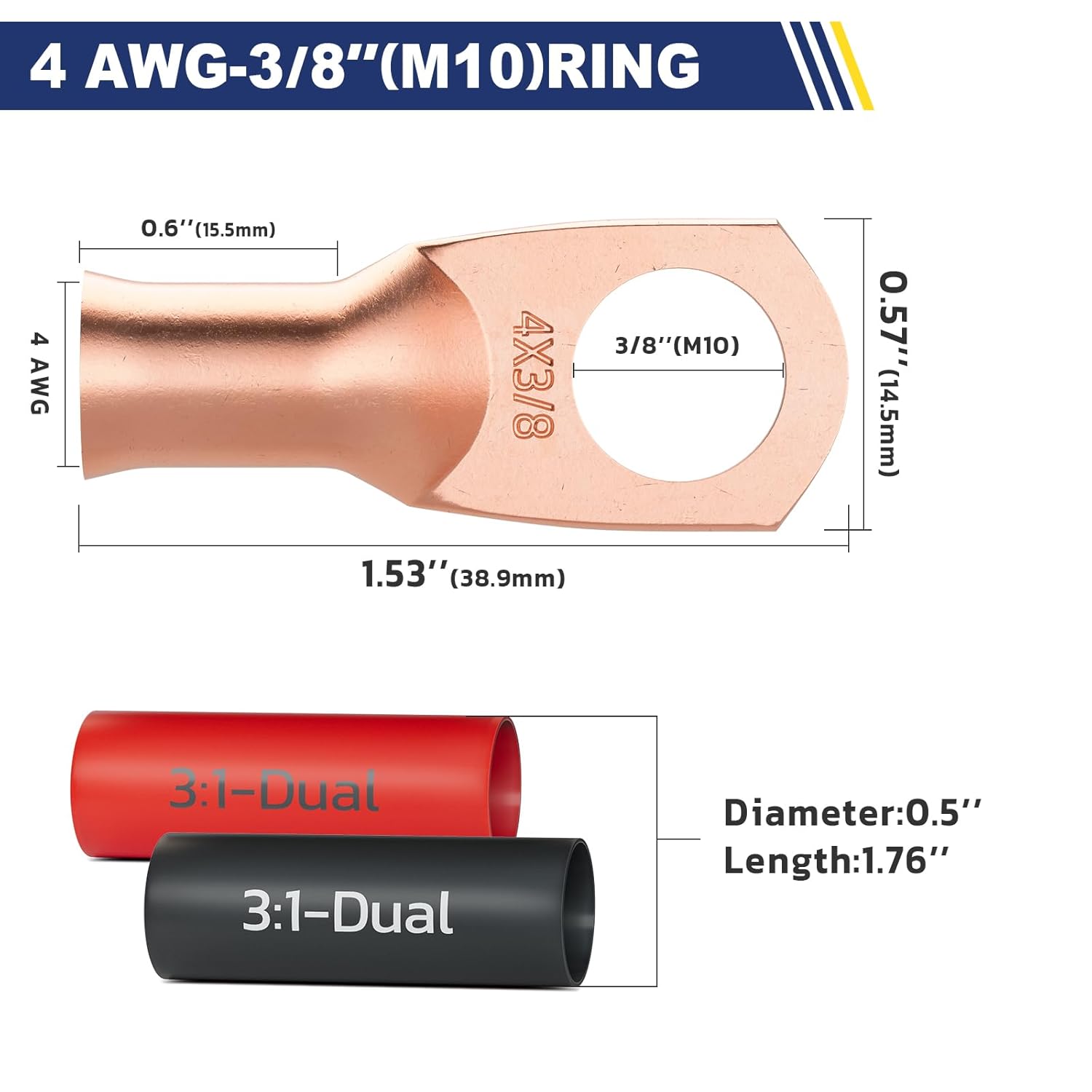 - Copper Lugs and Heat Shrink Tubing Kit: 10 PCS 4 gauge (AWG) - 3/8" (M10)ring terminals copper wire lugs and 10 PCS 3:1 Dual Wall Adhesive Heat Shrink Tubing(5 black and 5 red), and comes with a sturdy clear plastic jar that make battery cable ends easy storage
