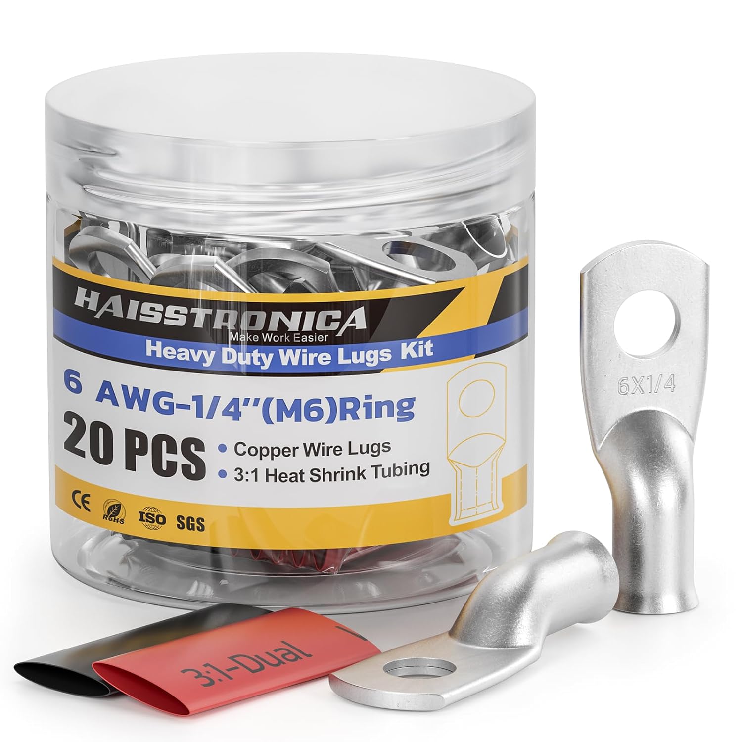 - Tinned Copper Lugs and Heat Shrink Tubing Kit: 10 PCS 6 gauge (AWG) - 1/4" (M6)ring terminals tinned copper wire lugs and 10 PCS 3:1 Dual Wall Adhesive Heat Shrink Tubing(5 black and 5 red), and comes with a sturdy clear plastic jar that make battery cable ends easy storage