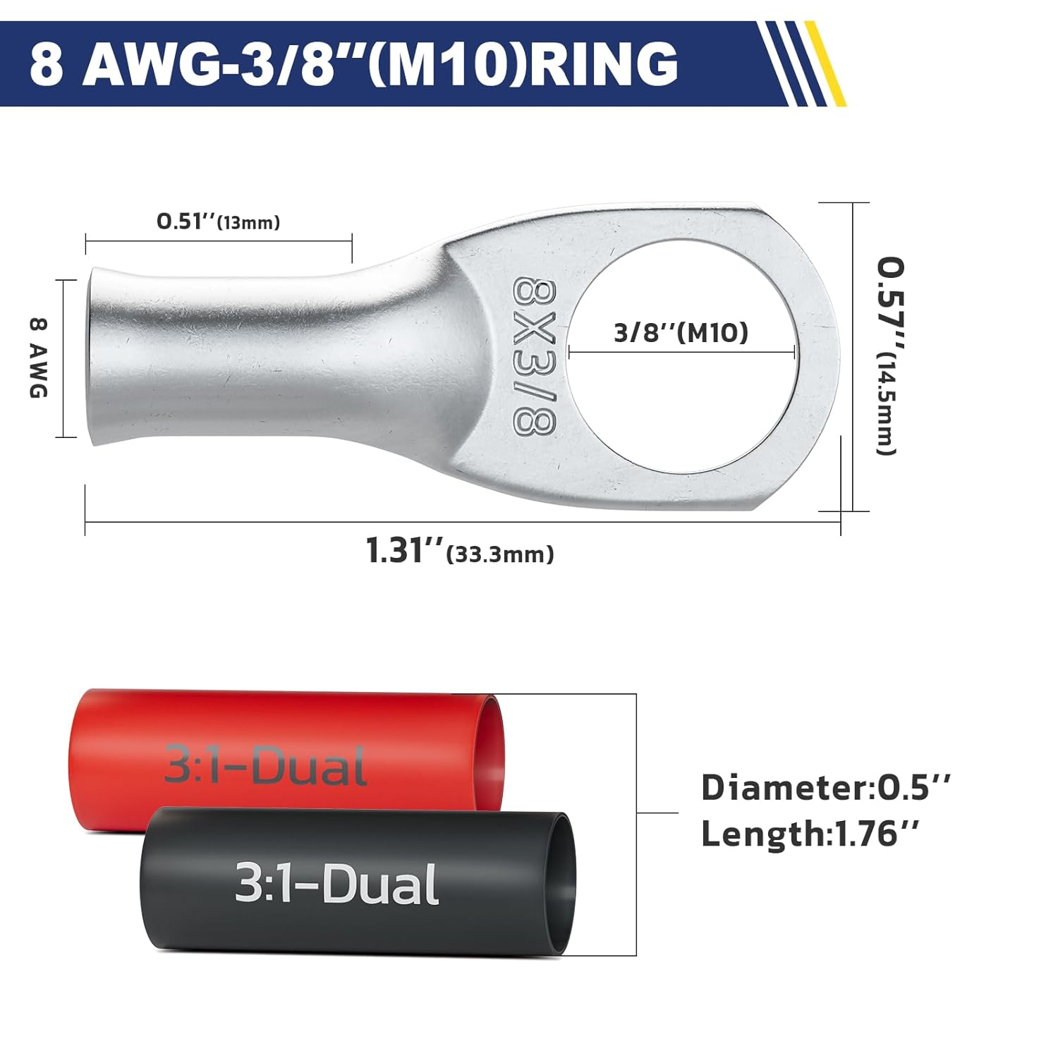 - Tinned Copper Lugs and Heat Shrink Tubing Kit: 10 PCS 8 gauge (AWG) - 3/8" (M10)ring terminals tinned copper wire lugs and 10 PCS 3:1 Dual Wall Adhesive Heat Shrink Tubing(5 black and 5 red), and comes with a sturdy clear plastic jar that make battery cable ends easy storage