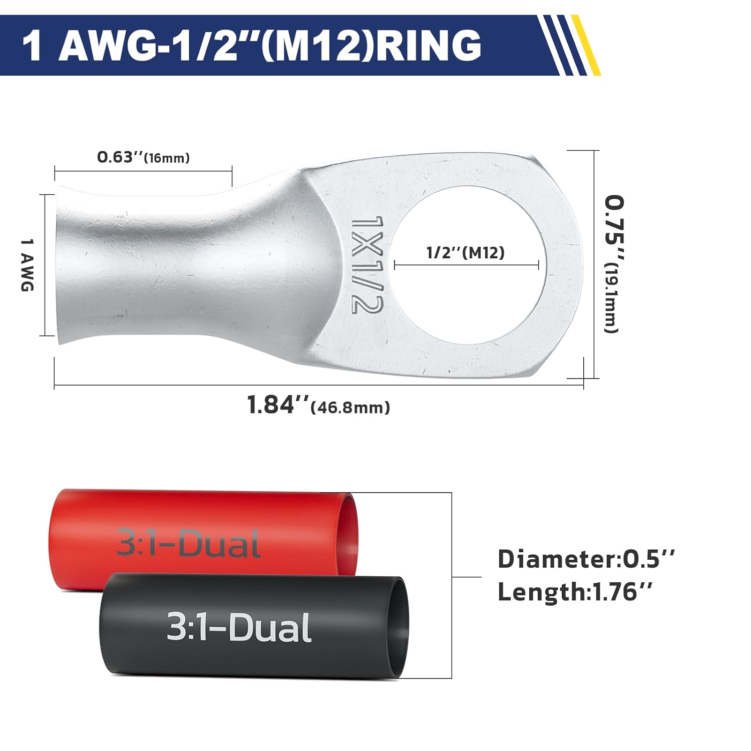 - Tinned Copper Lugs and Heat Shrink Tubing Kit: 10 PCS 1 gauge (AWG) -1/2" (M12)ring terminals tinned copper wire lugs and 10 PCS 3:1 Dual Wall Adhesive Heat Shrink Tubing(5 black and 5 red), and comes with a sturdy clear plastic jar that make battery cable ends easy storage