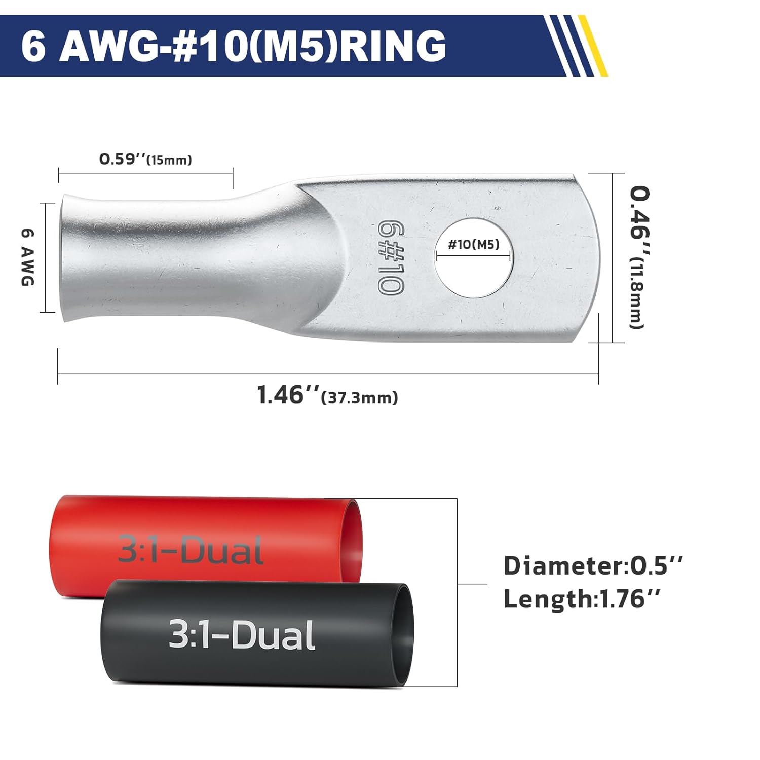 - Tinned Copper Lugs and Heat Shrink Tubing Kit: 10 PCS 6 gauge (AWG) - #10 ring terminals tinned copper wire lugs and 10 PCS 3:1 Dual Wall Adhesive Heat Shrink Tubing(5 black and 5 red), and comes with a sturdy clear plastic jar that make battery cable ends easy storage