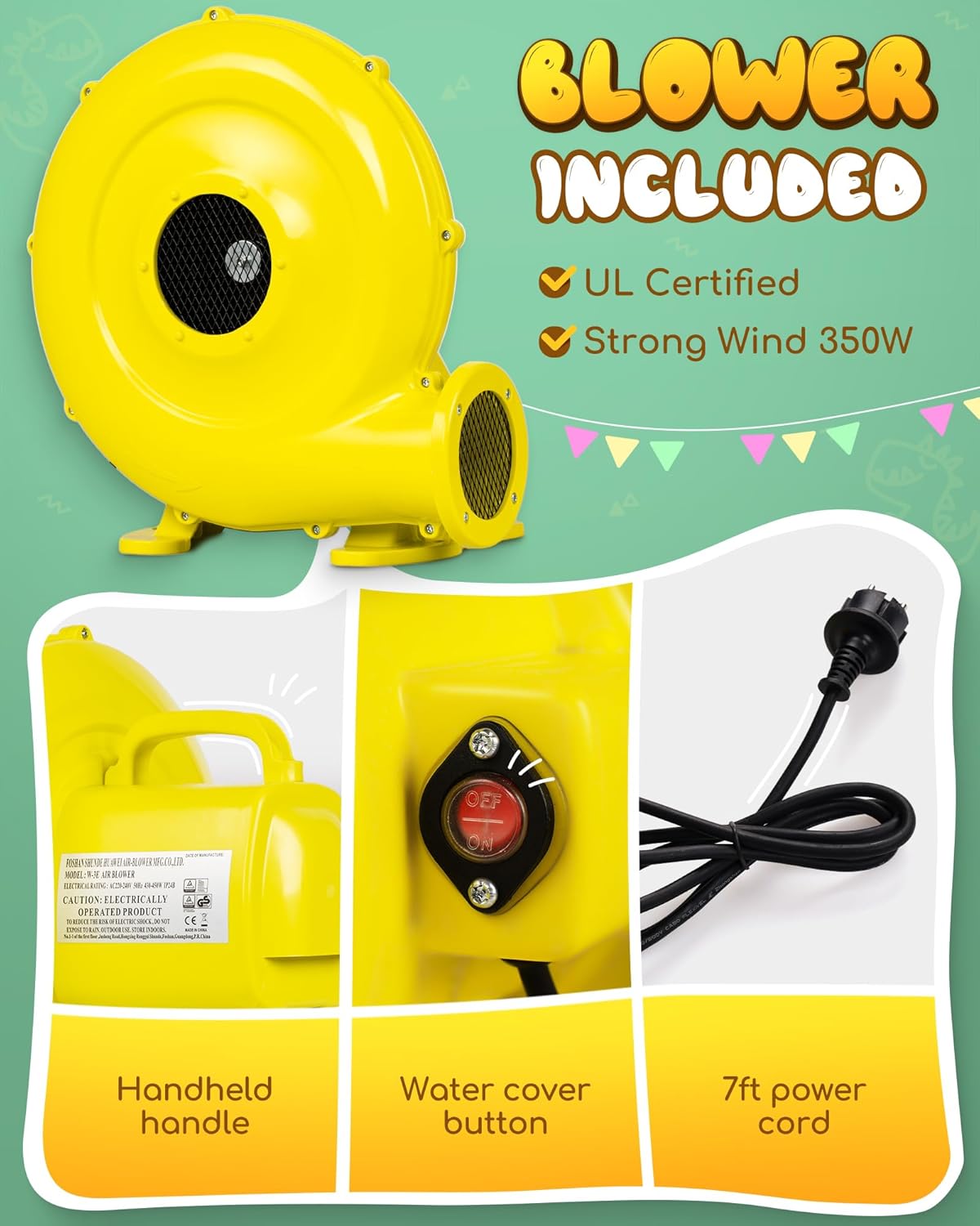 - 【Quick Setup for Instant Dino Fun】With just a 350W blower, the Dino Bounce House is up and ready in 1 minute! Easy to set up and perfect for spontaneous adventures, it allows your kids to dive straight into their dino-filled jungle with no waiting, giving them more time for bouncing, sliding, and exploring