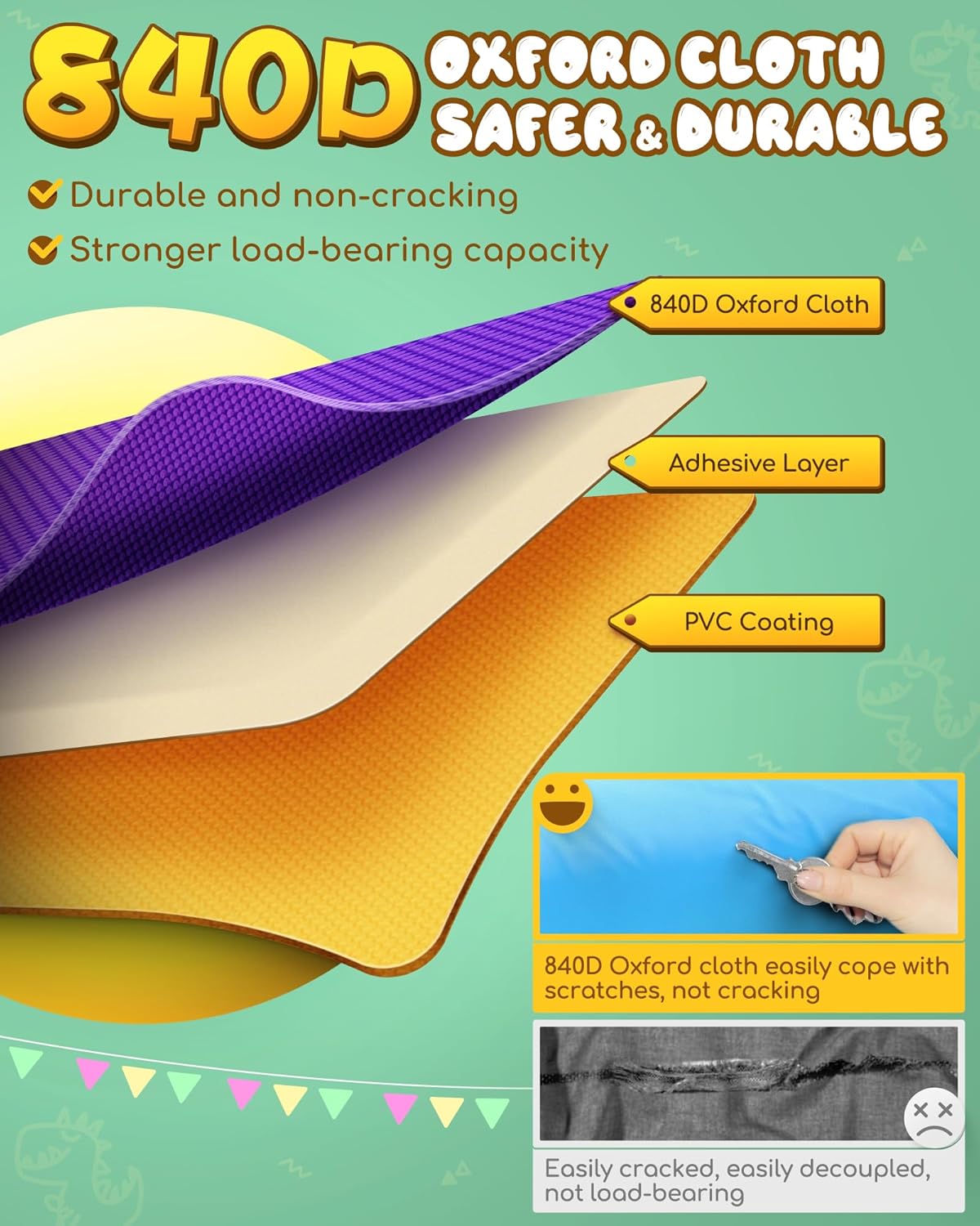 - 【High-Quality, Jungle-Ready Materials】Crafted from premium Oxford fabric with puncture-resistant 840D+420D tarpaulin, this bounce house is built to withstand hours of active play. Double-stitched beams provide extra strength and stability, ensuring long-lasting use even during the most adventurous dino explorations. A reliable and safe choice that parents can trust