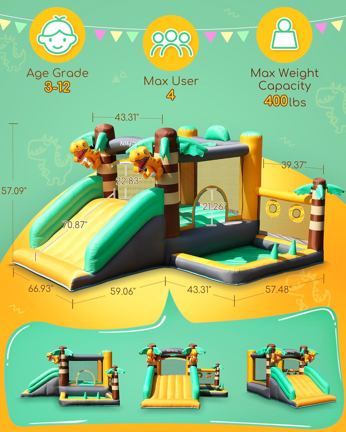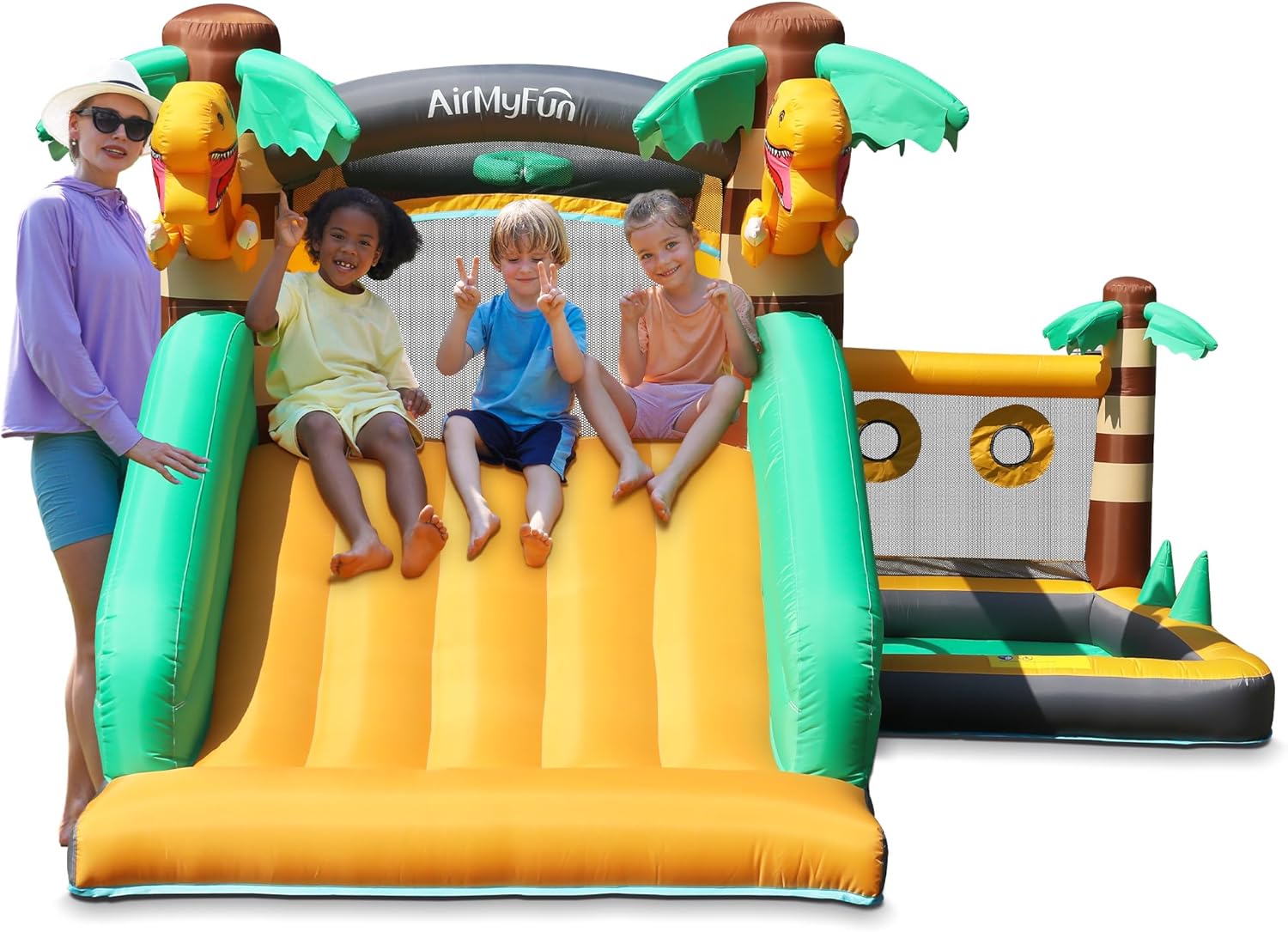 - 【The Ultimate Dino Adventure Gift】Give the gift of adventure with AirMyFun’s Dino-themed Bounce House! Perfect for birthdays, Christmas, or Halloween, this inflatable castle takes kids on an exciting journey into the prehistoric jungle. The package includes everything they need for endless fun