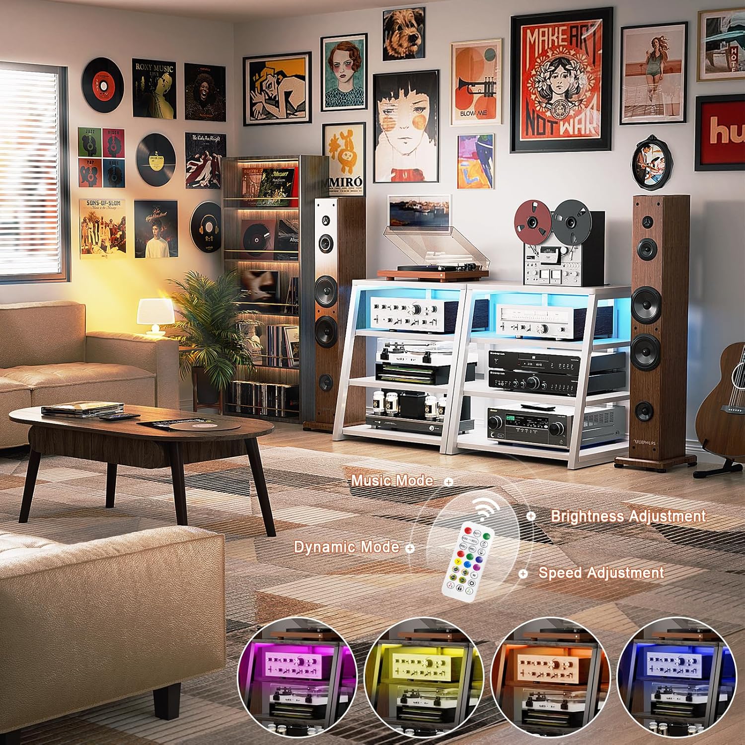 Armocity 4-Tier AV Media Stand with Power Strips, Stereo Stand with LED Lights, Audio Tower Rack with Adjustable Shelves, Small Entertainment Center, 30'', White