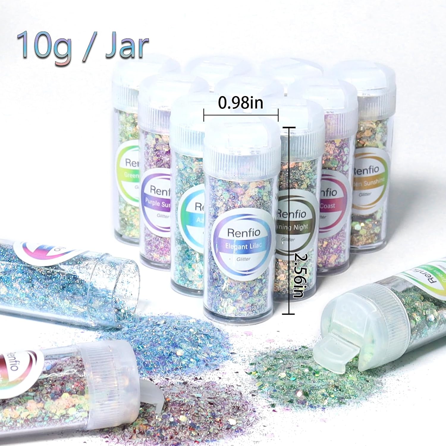 Renfio Opal Chunky Glitter Set - 16 Dreamy Amber Colors, 10g Each - Holographic Fine Glitter Mix, Iridescent Flakes for Snow Globe, Tumbler, Nail Art & DIY Crafts