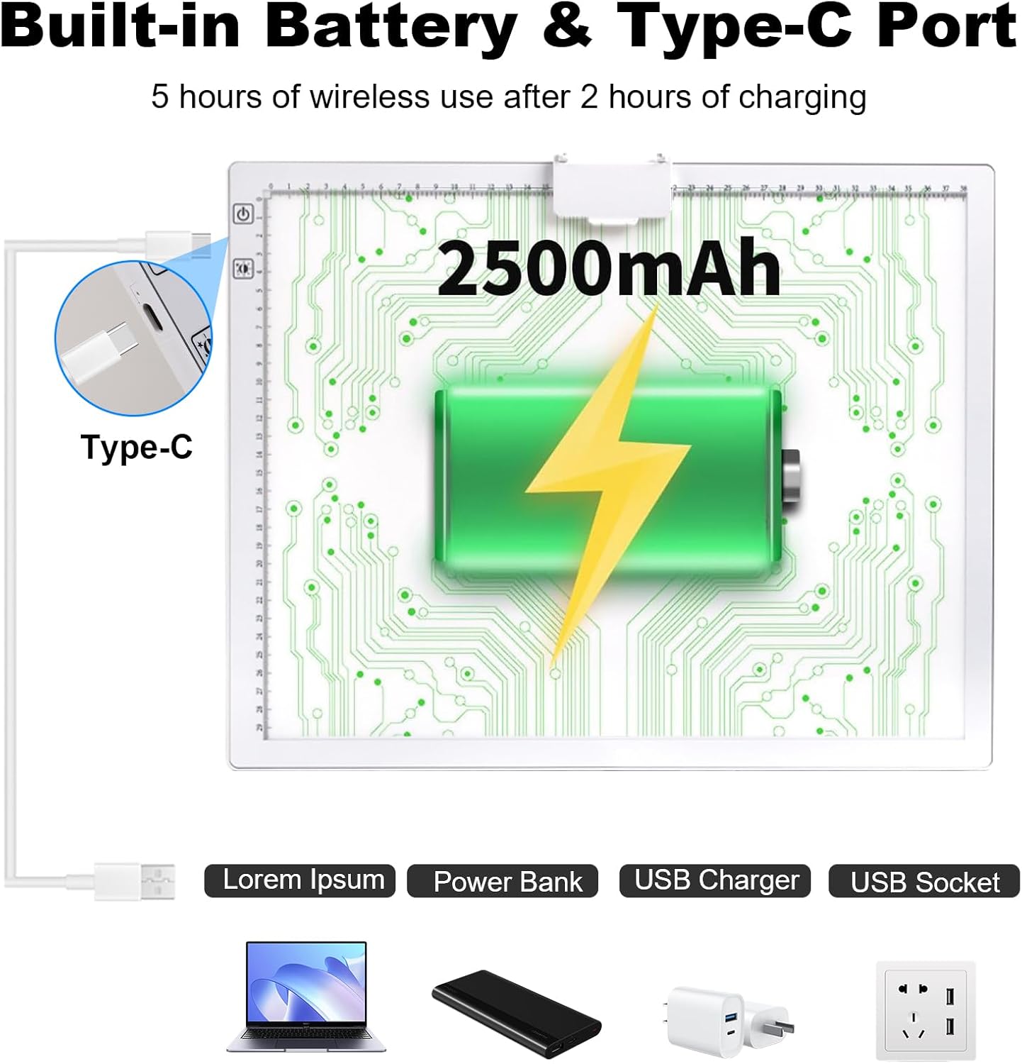 - ā[2500mAh Rechargeable Battery]--The A3 rechargeable light pad contains a 2500mAh lithium battery, which can work for 5 hours after 2 hours charging. Applicable to cordless use and charging while using.