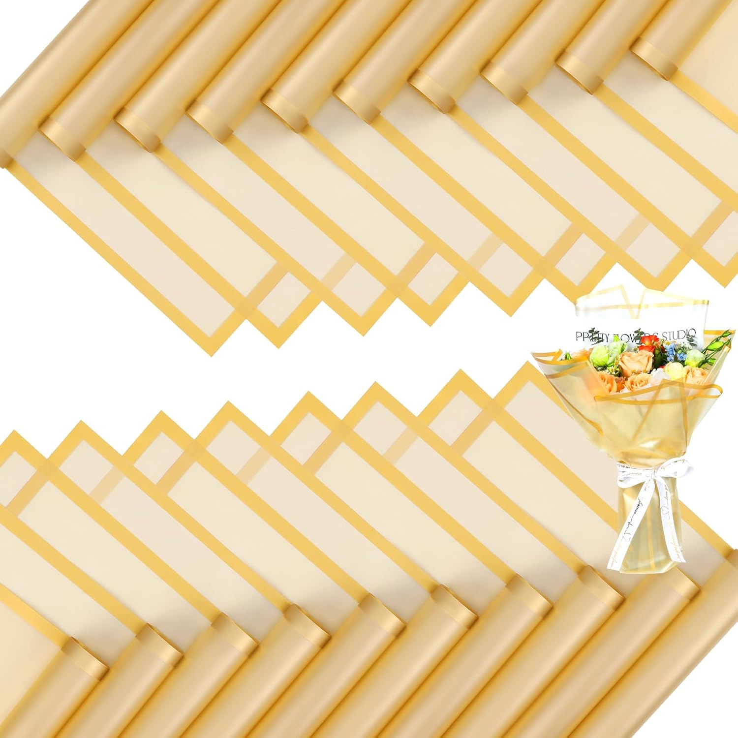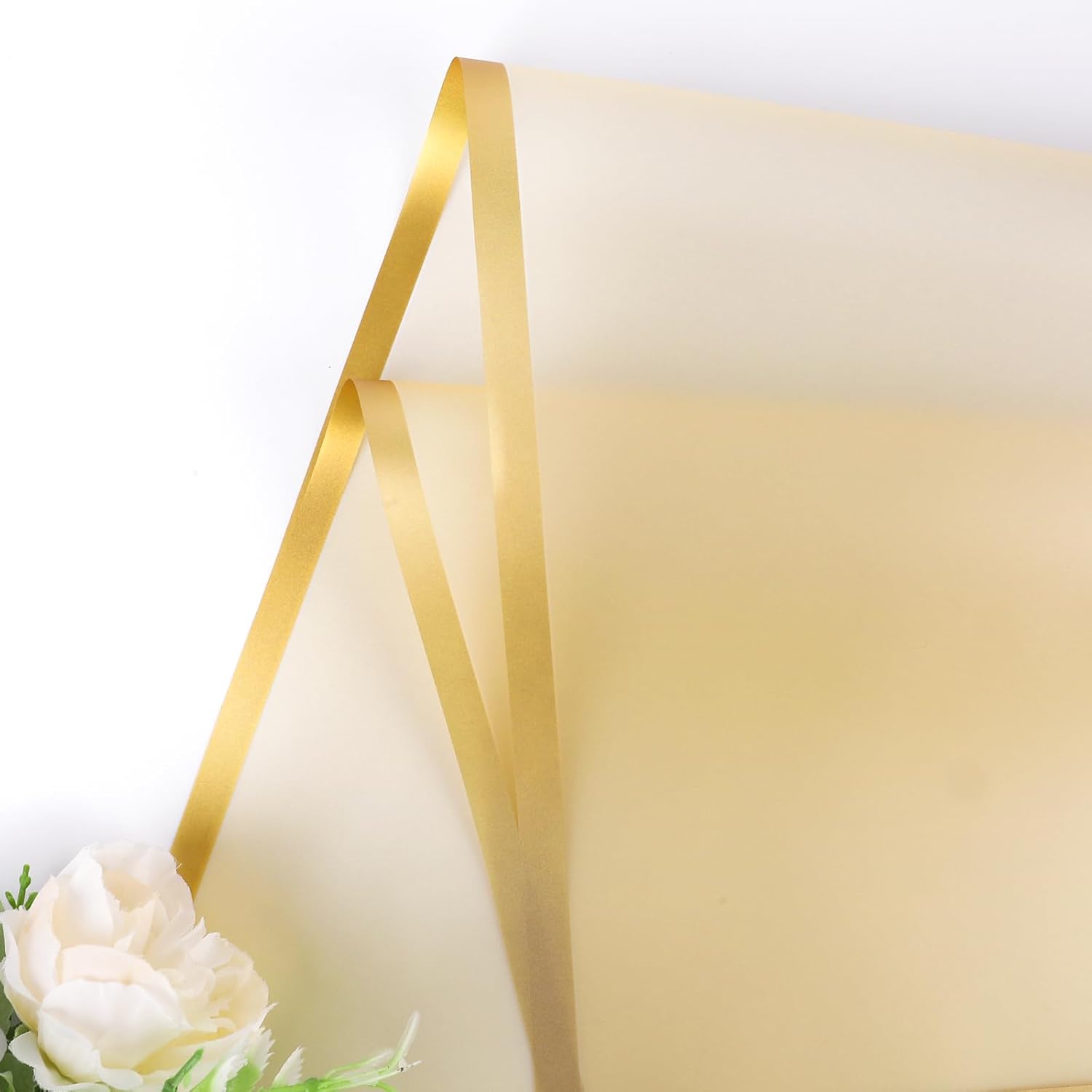 - 【Elegant Design】Florist paper is designed with using classic semi transparent material, the edges are designed in gold color with a frosting, features glossy and vibrant colors, smooth and comfortable to touch. Is the perfect choice for bouquet packaging and gift box packaging.