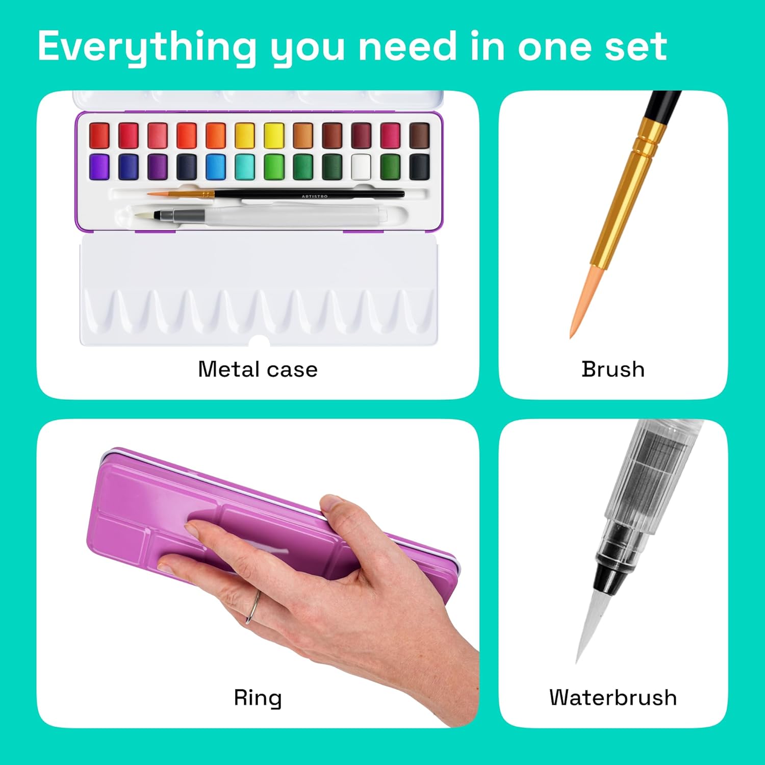 ARTISTRO Watercolor Paint Set 24 Colors, Travel Watercolor Set in Portable Box, Mini Water Colors Paint for Artists, Beginners, Amateur Hobbyists