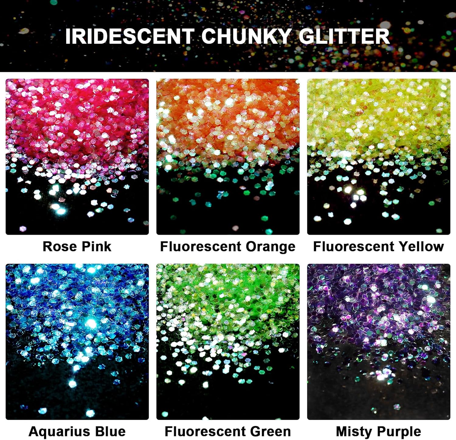 - 🥰🥰Multi-Color Glitter Set: The bulk glitter set include rose pink, fluorescent green, fluorescent yellow, fluorescent orange, misty purple, aquarius blue glitter sequins, which is suitable for graduation party decorations, birthday party, theme parties, masquerades, and various festivals. Each set contains 6 jar 4.23oz/120g of craft glitter and color labels.