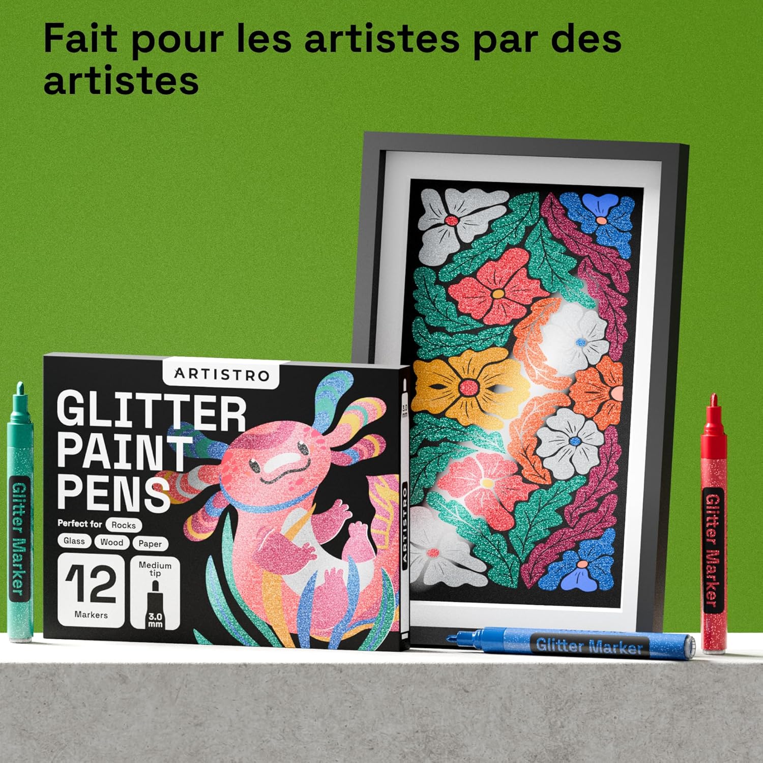 - Stunning Effect: Artistro glitter pens utilize vivid, acrylic ink that dries quickly to produce a very durable opaque and glossy finish on almost all surfaces. These glitter markers have a Japanese nib and Italian ink thatβs water-resistant, heat-resistant, and flows without jamming or flooding.