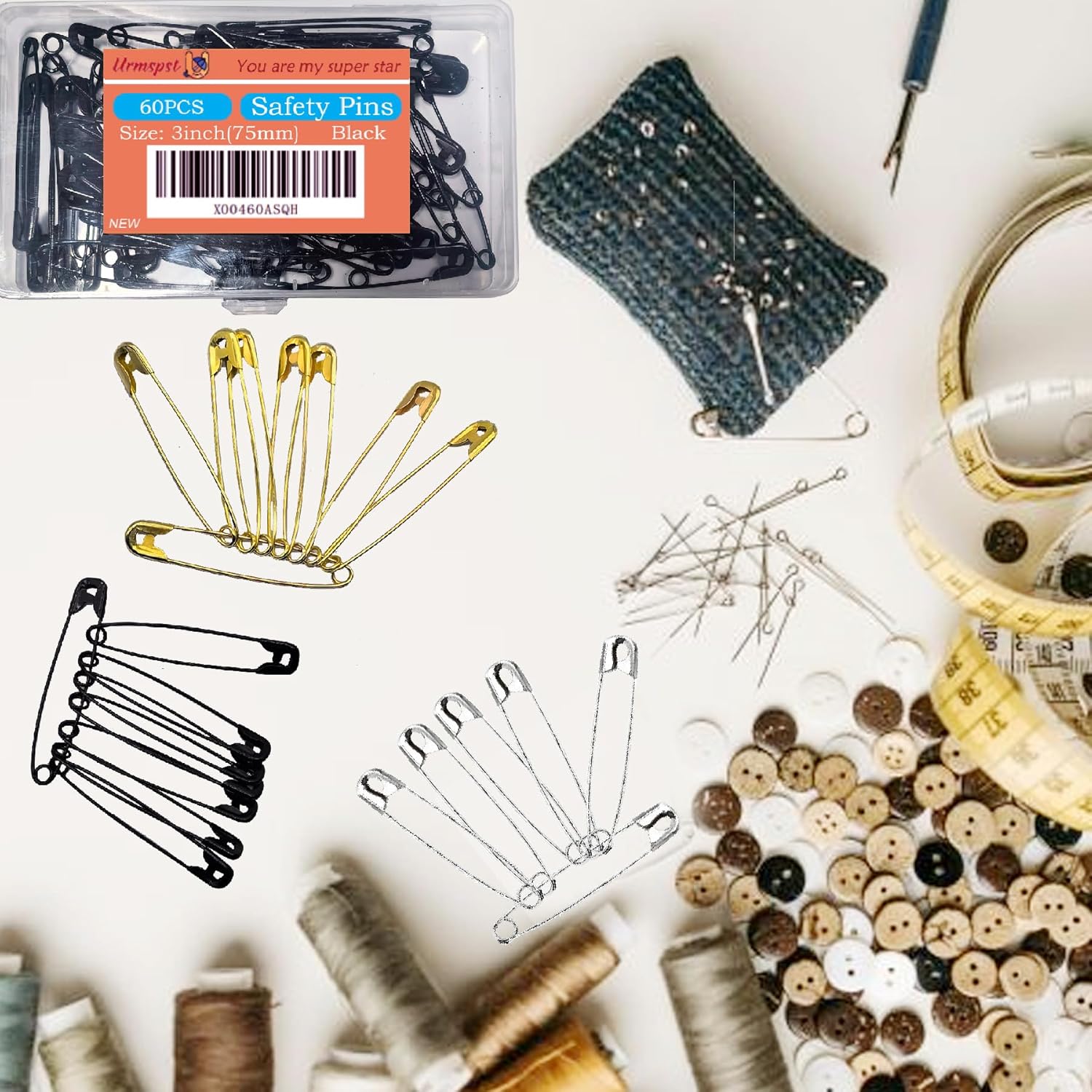 - š [Great Value Pack] Set of 60pcs, 3.0in(75mm) large safety pins with a convenient storage box, Black color safety pins to make your daily life more convenient.