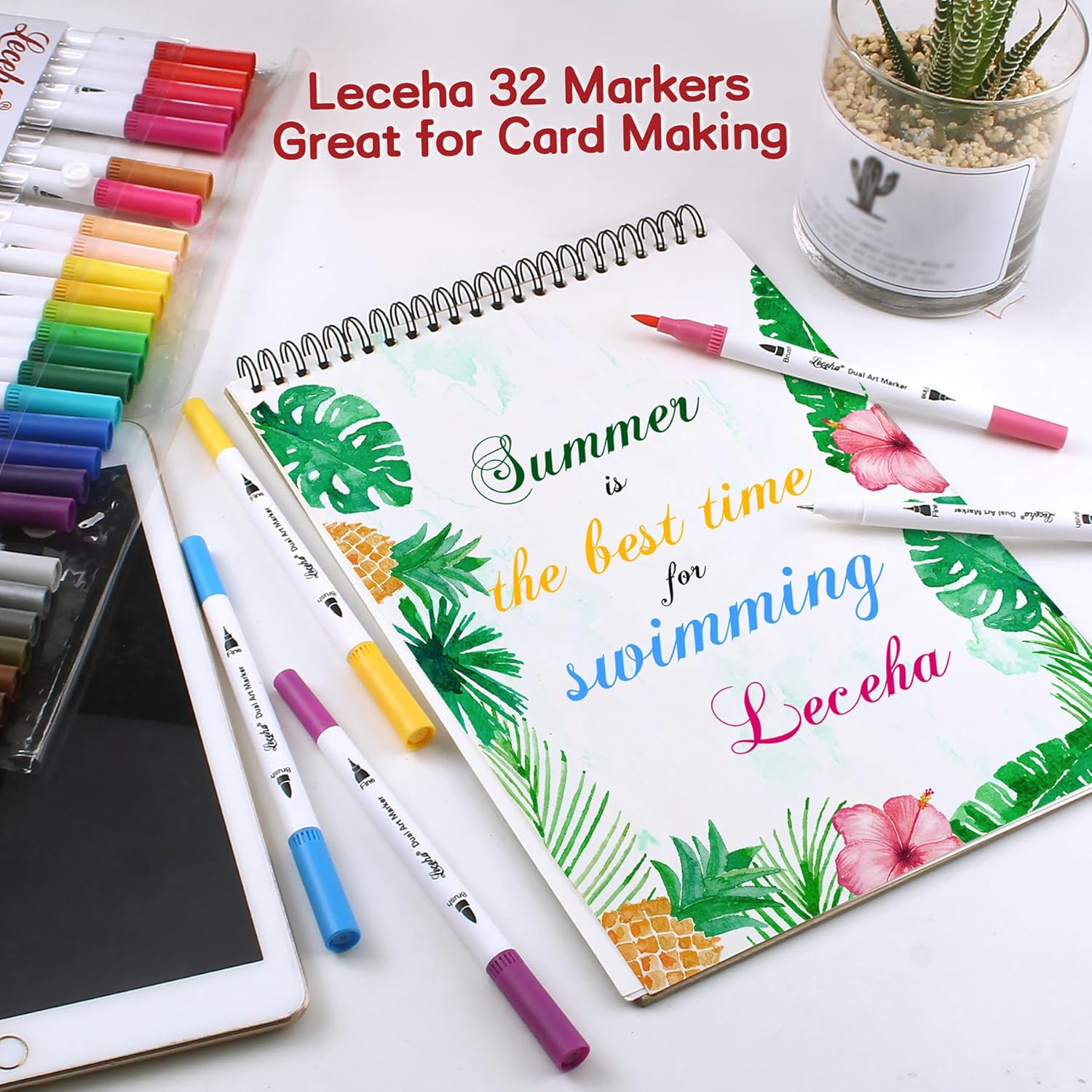 - DUAL TIP MARKERS: 32 Coloring Markers Brush Tip (1-6mm)& Fine Point(0.4mm),1-6mm soft brush tip for shading, coloring, quickly color in large areas art project, hand lettering and calligraphy beginners; 0.4mm fine tip is great for sketch outlining & details, works well for intricate coloring books, writing, doodling.