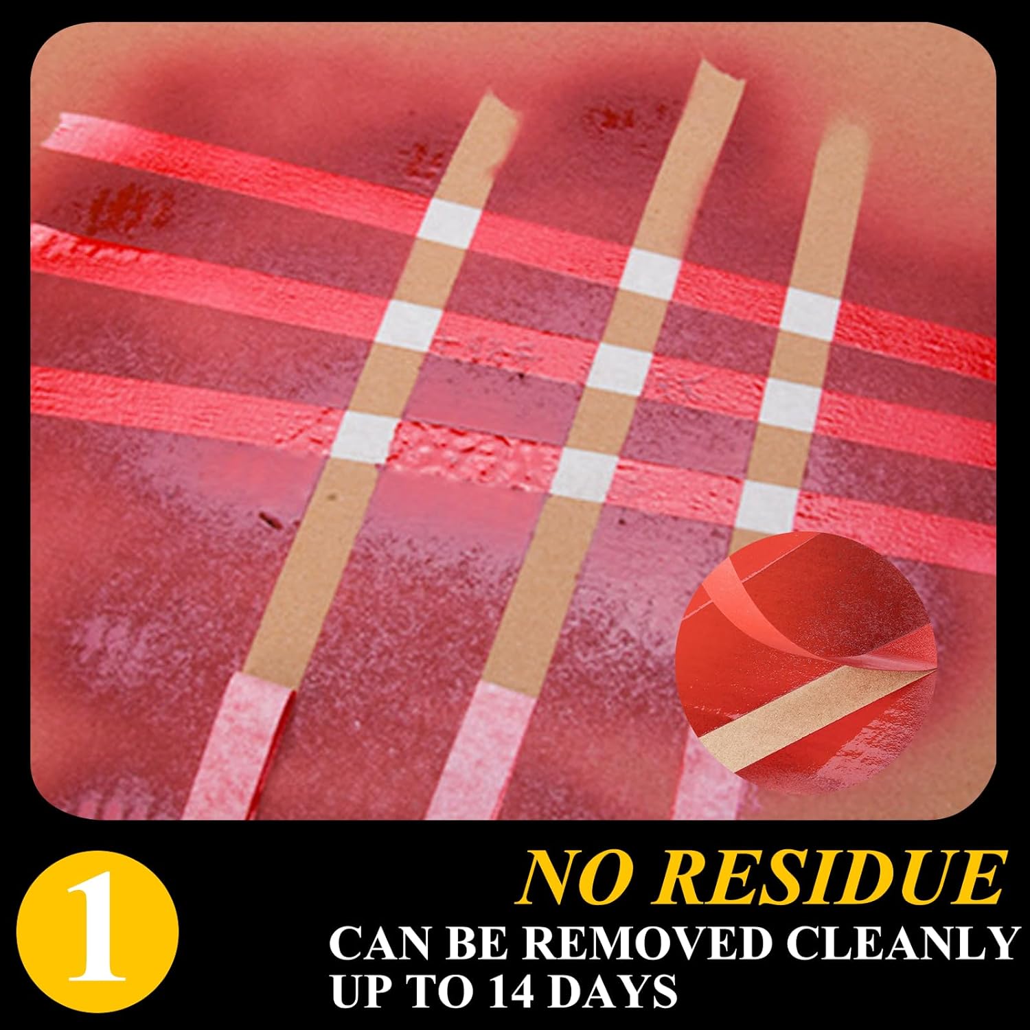 - DAMAGE-FREE: Our color tape use medium adhesive glue that ensured it can be removed easily without leaving a sticky residue behind, won't damage the wall (PS: in indirect or no sunlight environment, can stay on surfaces for up to 14 days with no residue). Specially designed for various surfaces, like flat, smooth or slightly textured walls, glass, metal, wood, baseboards, ceramic tiles, hardwood floors, trim, plastic. Note: For better effect, prevent sticky side long-term exposure to air.