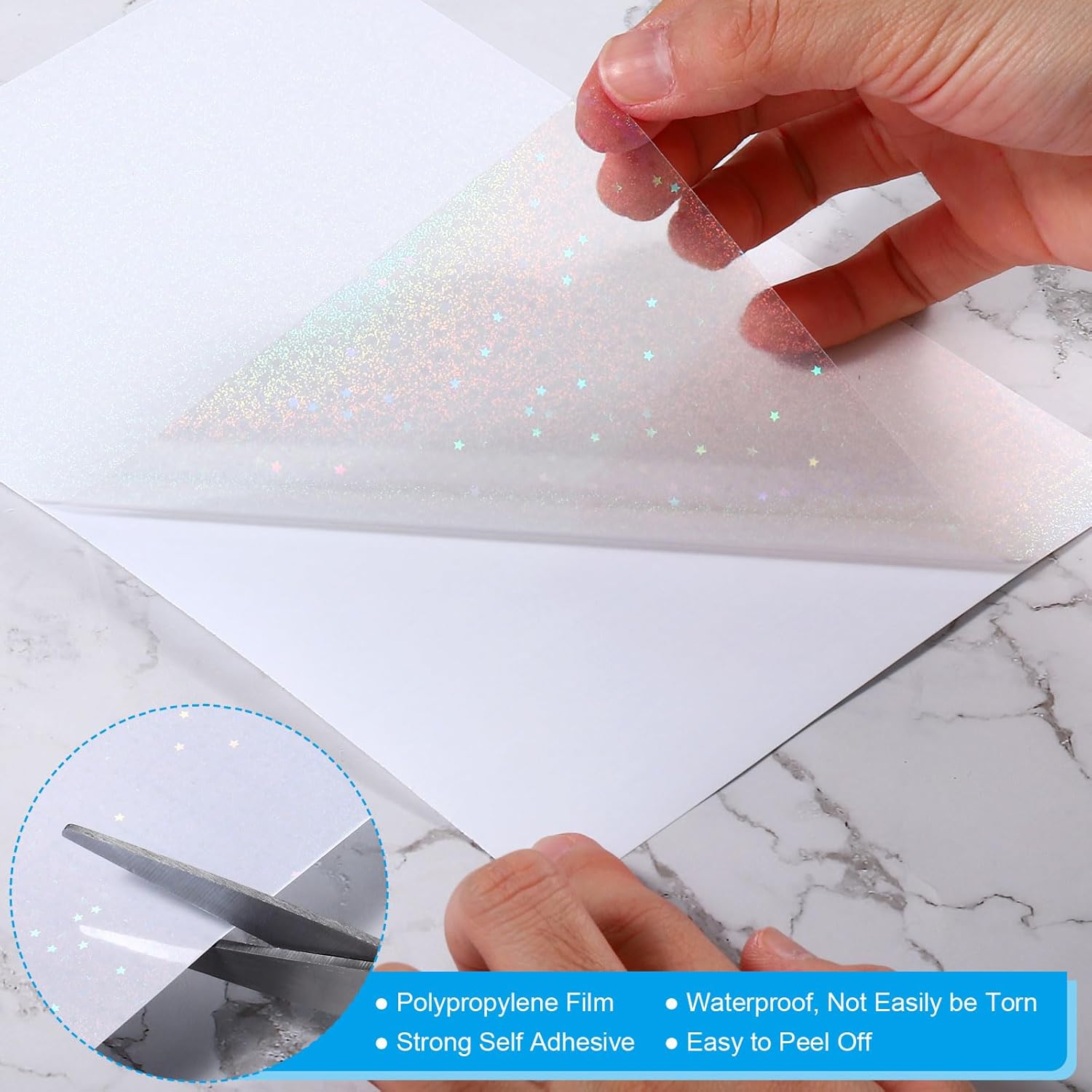 - Specification: Material: Polypropylene (Laser Film), Paper (Backing); Color: Transparent; Pattern: Star; Size: A5 Size (LxW: 210x148mm/8.3x5.8inch); Package List: 20Sheets x Holographic Sticker Paper