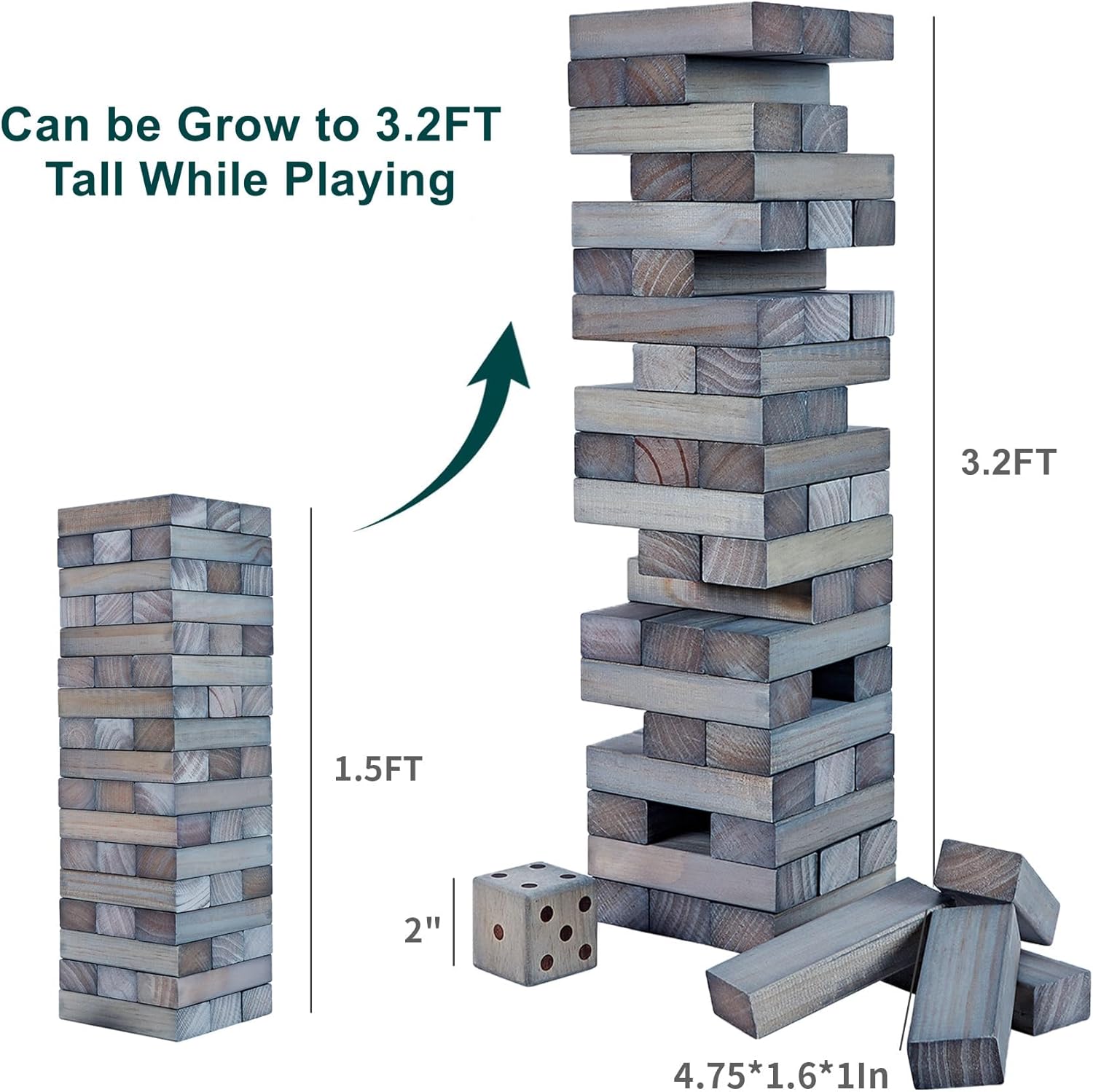 - 54 Pieces Giant Timber Game: The Classic Tumble Tower Set comes with 54 pieces Tumble Blocks, 1 pcs Dice, 1 pcs White Scoreboard, and a Zipper bag. Each crafted wood stack measures 4.75x1.6x1 In. The Stacking Games bring everyone challenge and fun, starting out at 1.5 FT (18 rows) tall and can be grown up to 3.2 FT tall tower when played