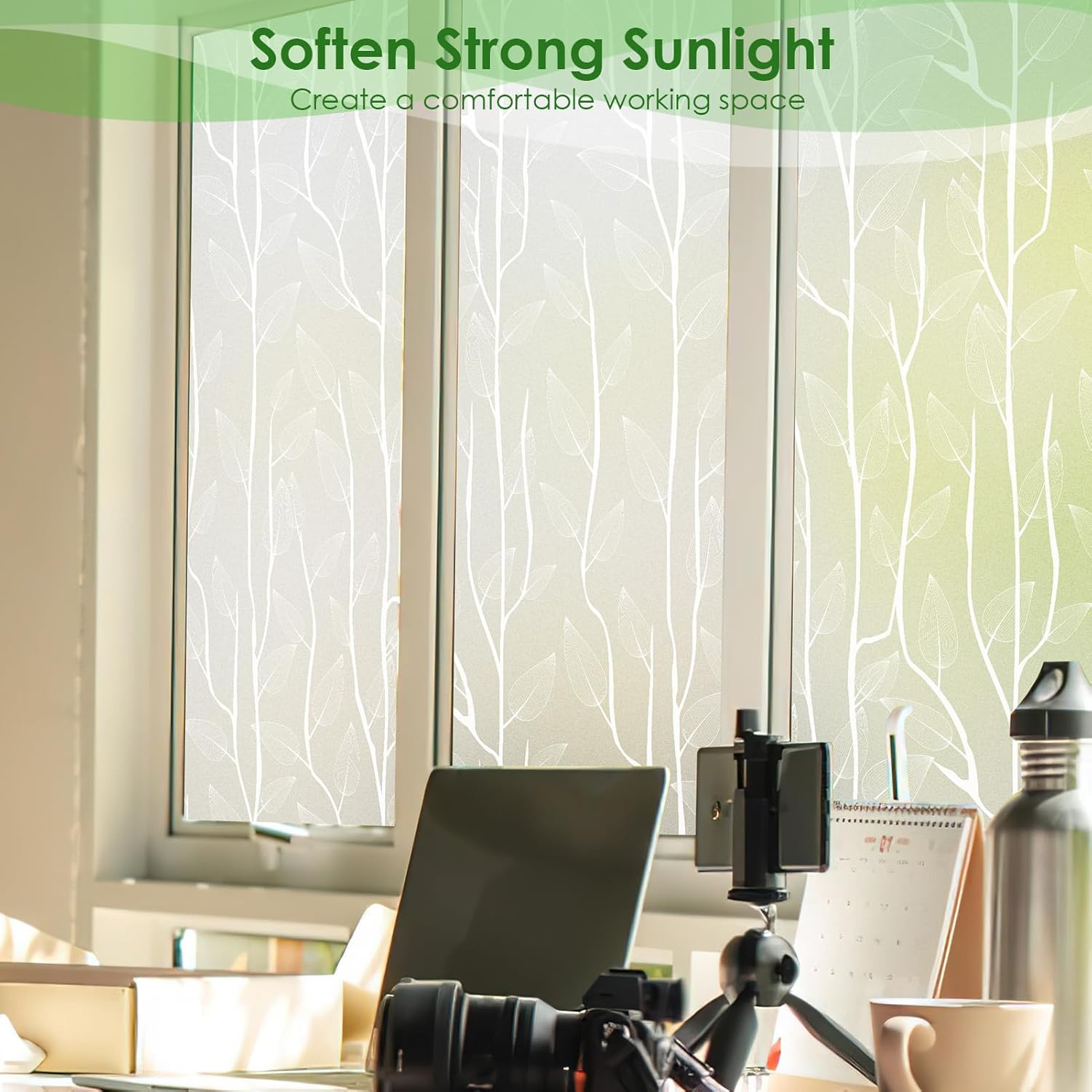 DKTIE Nordic Leaves Window Privacy Film Decorative Stained Glass Sun Blocking Heat Control with Free Installation Tools, Privacy Window Film Day and Night (White, 17.7'' x 78.7'')