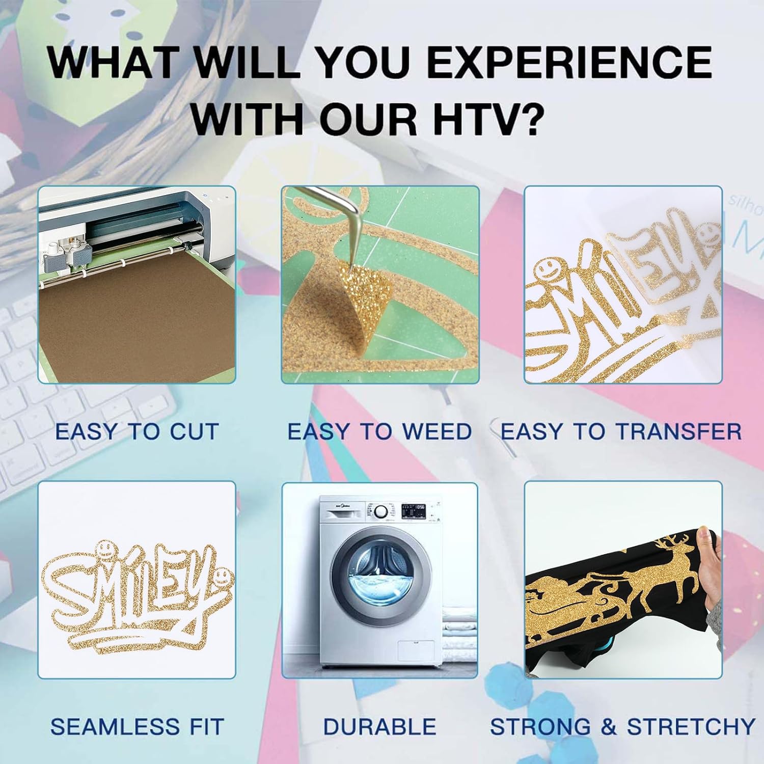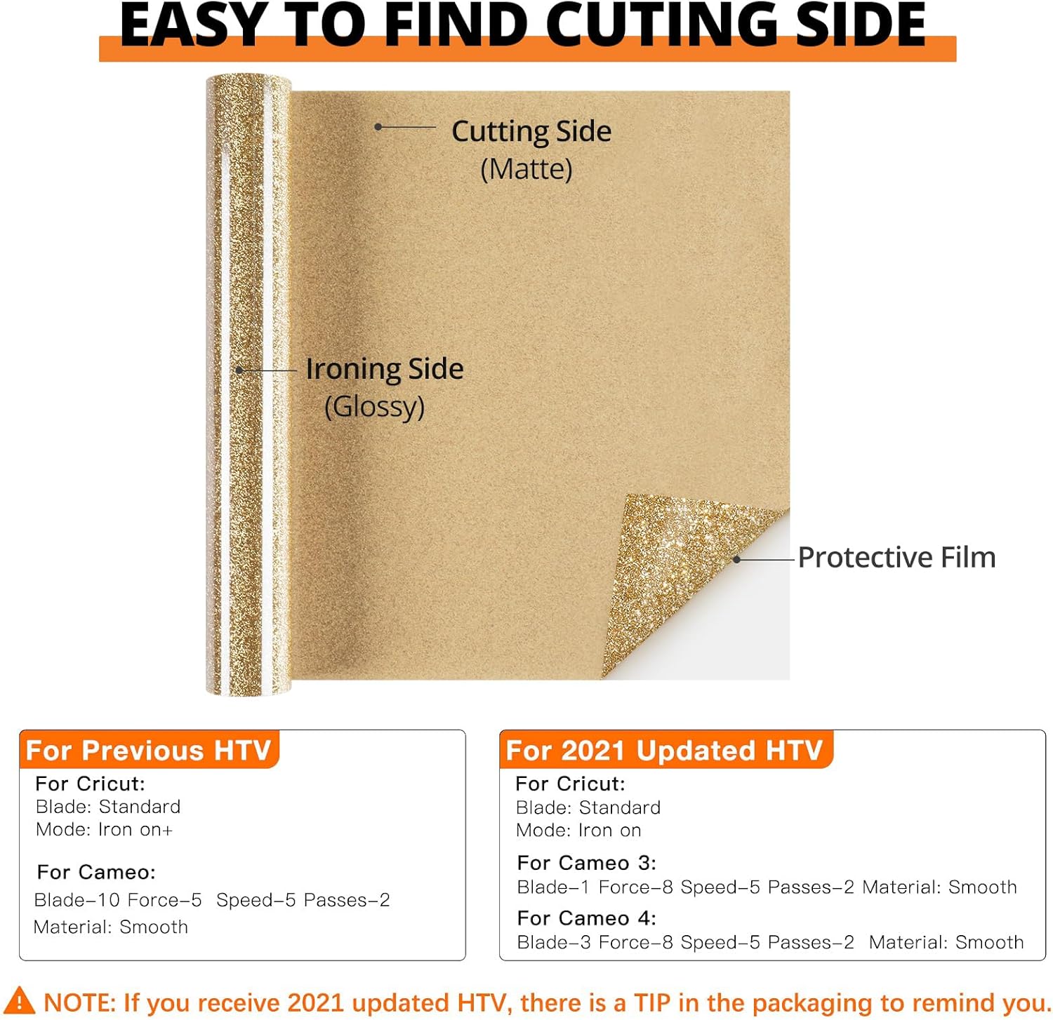 - 【10 INCH x 8 FEET】HTVRONT glitter htv are easy and convenient to cut into different size of art designs or logos or letters and perfect for 12''x12" and 12''x24" cutting mats. Our glitter iron on vinyl are compatible for all cutter machine, also uses fine glitter, which is smooth, easy to layer and apply. All the glitters are sealed in and never residue