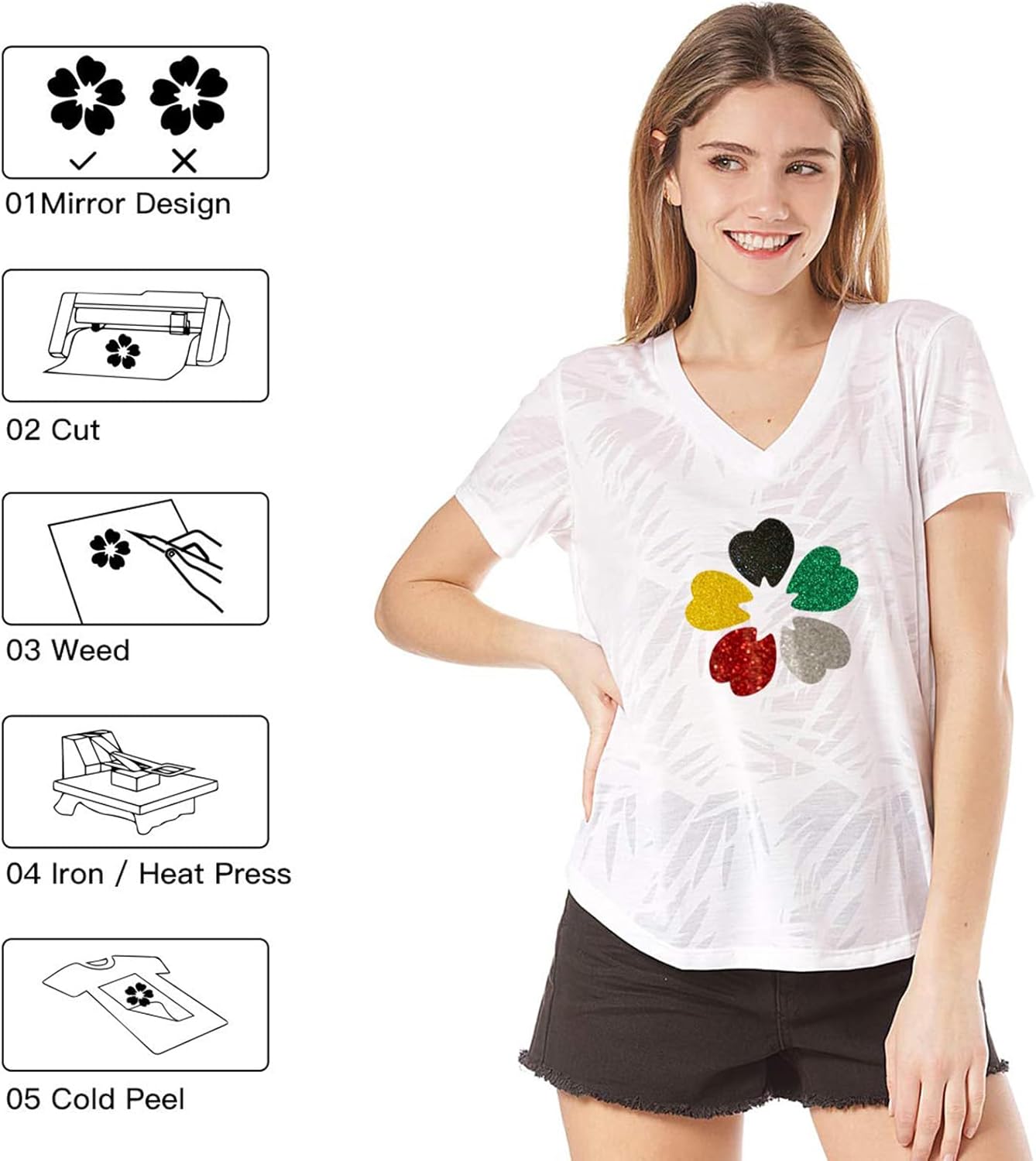 - 【EASY TO CUT WEED TRANSFER】The glitter htv is thick with an excellent cutting application characteristics, any cutters’ blade can cut it through easily. The medium tack transfer film makes weeding like a dream, the glitter heat transfer vinyl is extremely sensitive to heat and pressure makes transfer quickly, which will save your time. The glitter iron on vinyl is sensitive to temperature and pressure, which can be heat transferred on any t-shirt easily