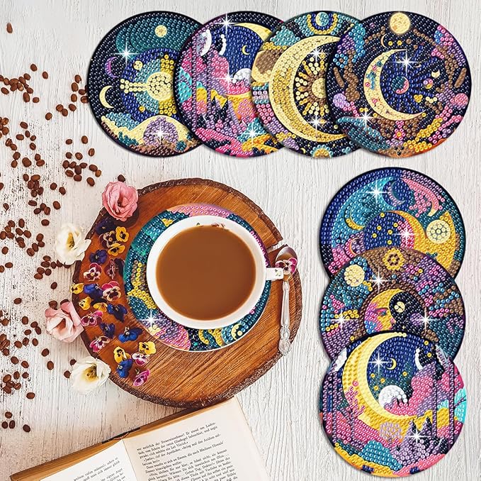 Diamond Painting Coasters Kits for Adults, Moon Diamond Coaster Art Kits for Beginners, Adults Stress-reducing Handicrafts Coasters with Holder Gem Art Kits Paint by Diamond 8 PCS(Moon)