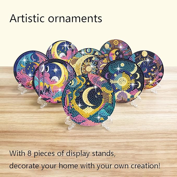 - Package includes--Size:diameter 3.9in(10cm). Diamond Painting Coaster x 8, Cork Pad x 8, Transparent display stand x 8, Coaster Holder x 1, Colorful Diamond x 1, Wax x 1, Pen x 1, Diamond Tray x 1.