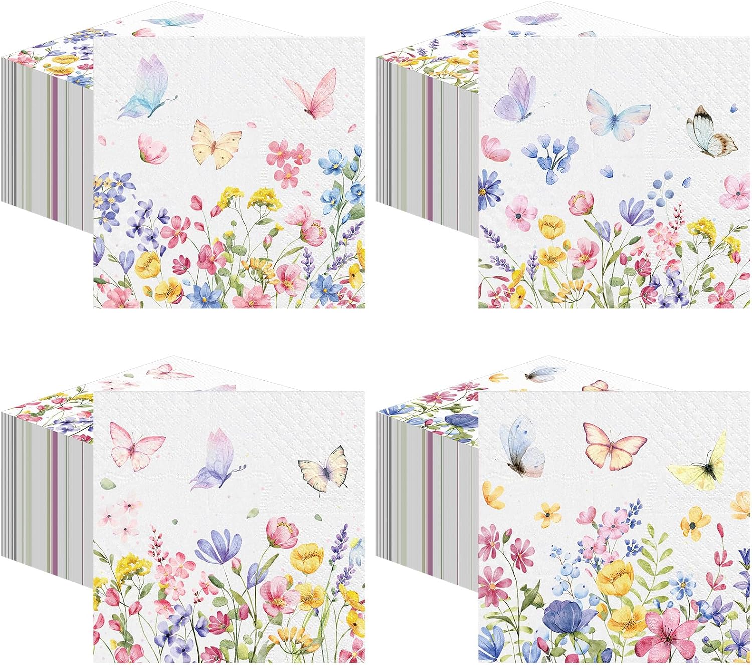 Fulmoon 200 Pieces Summer Floral Cocktail Napkins Disposable Wildflower Dessert Paper Napkins Bulk Flower Decoupage Beverage Towel for Summer Tea Party Dinner Decorative