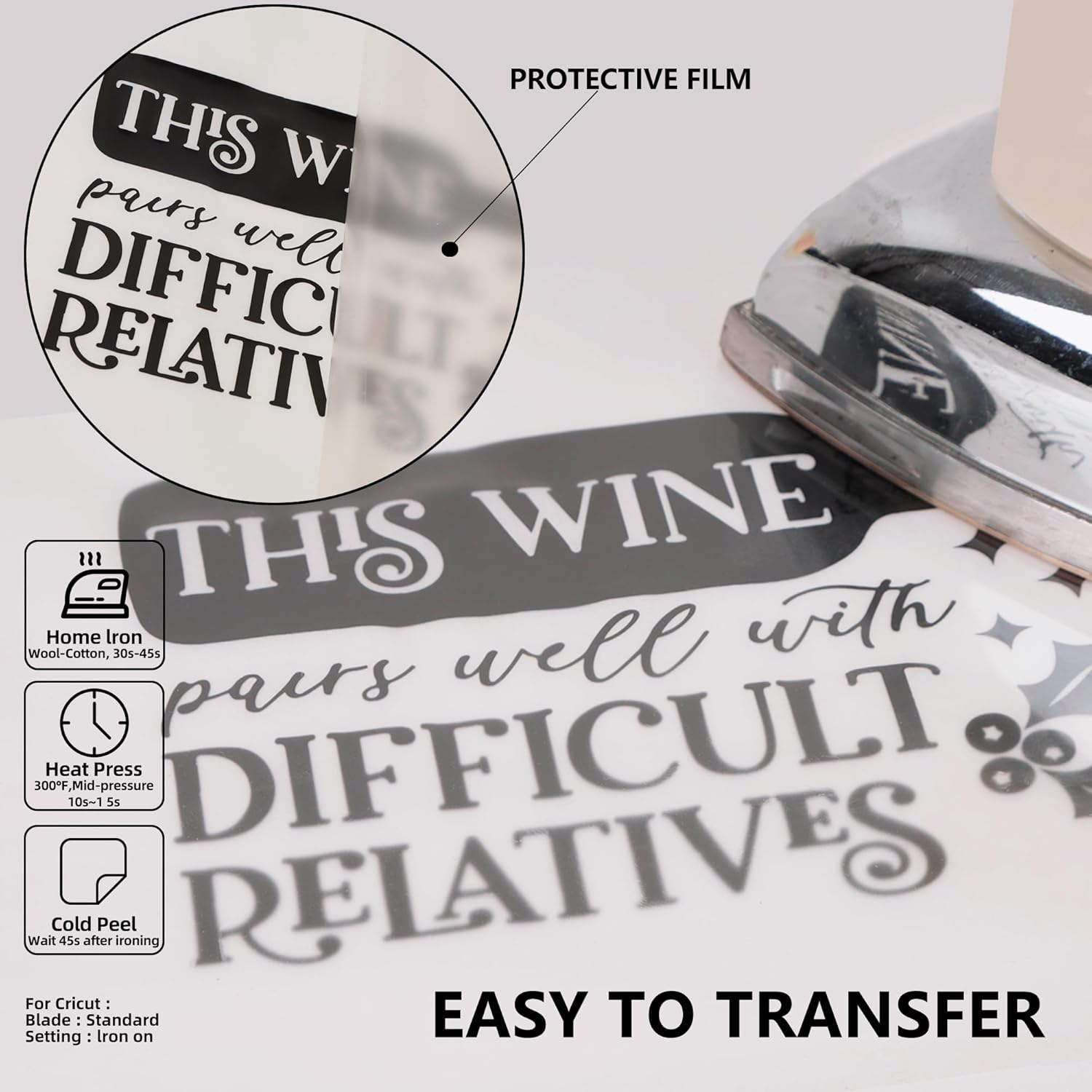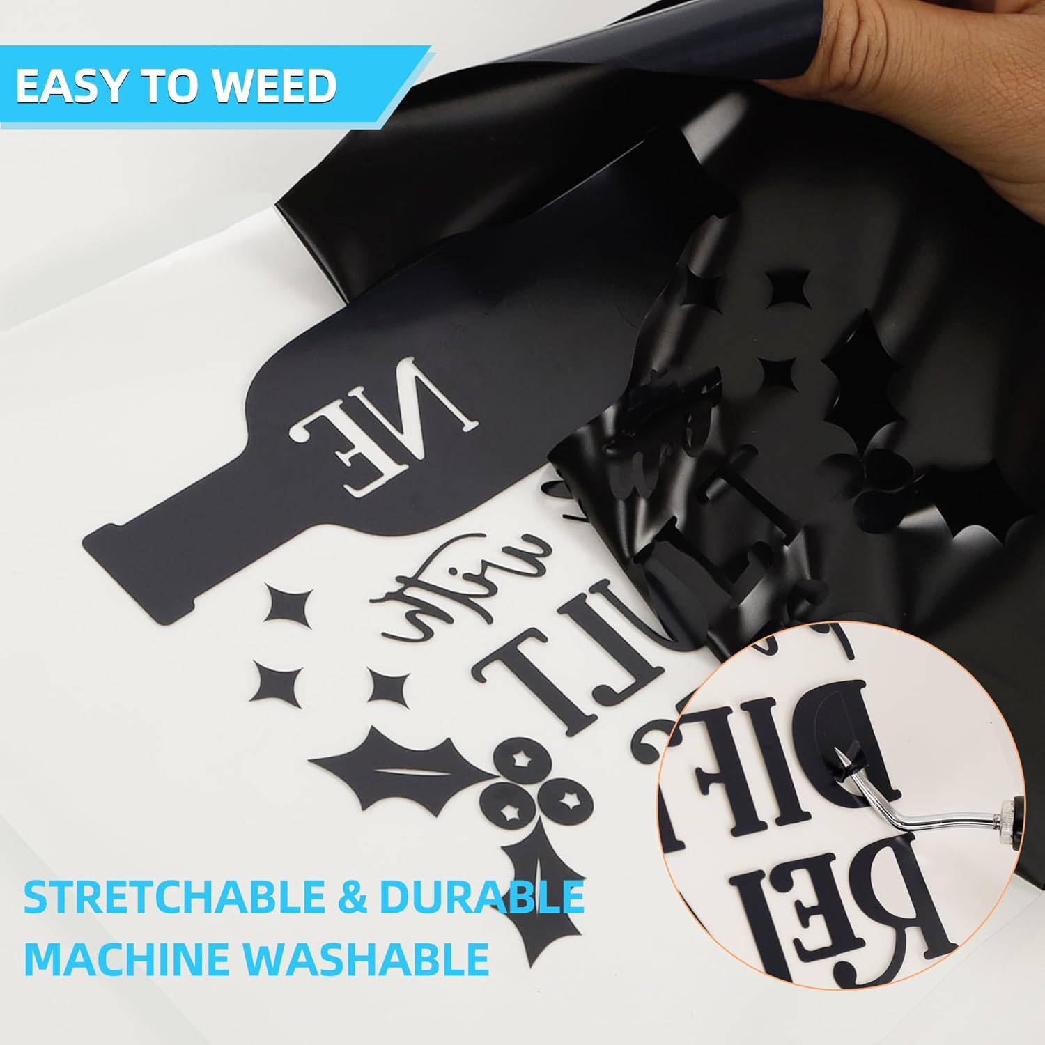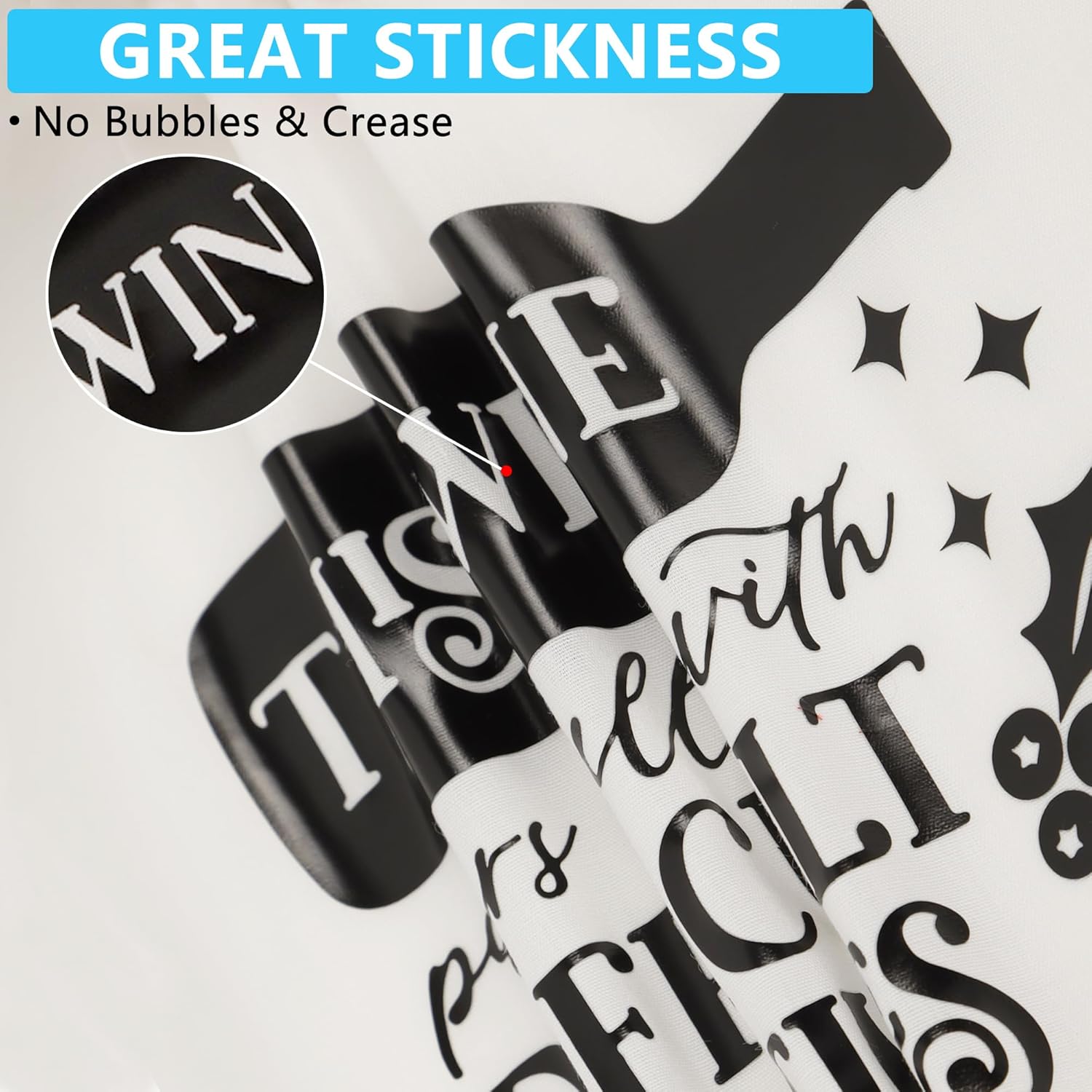 - UNIQUE ADHESIVE BACKING: Our black iron on vinyl has two layers, a colored membrane and a protective sticky plastic membrane. You can stick back when you weed wrongly, the misaligned part can be glued back without wasting material. The sticky transparent plastic film can be fixed on the clothes, which don't move easily. So it is suitable for beginners, easy to weed and heat