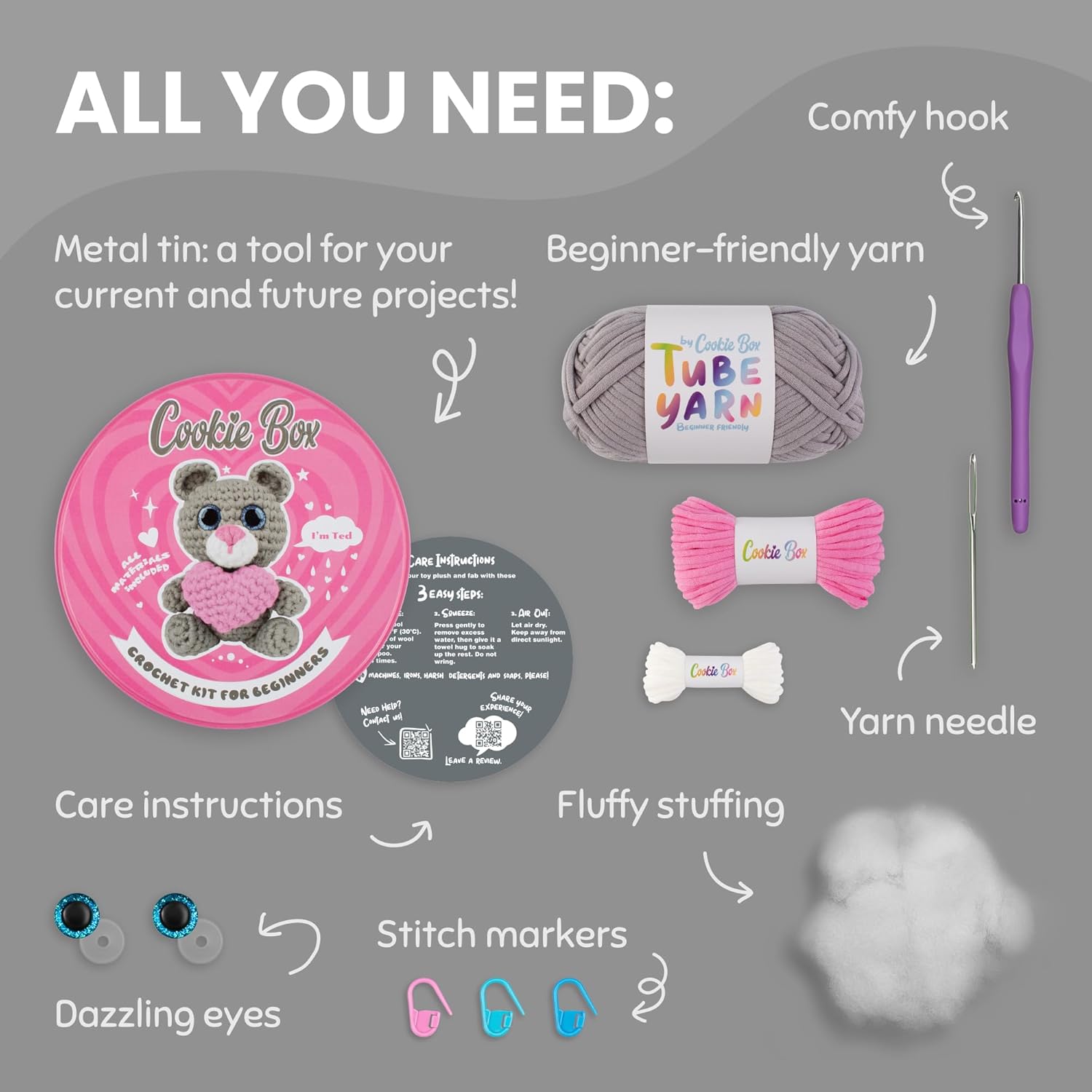 Cookie Box Crochet Kit for Beginners β Gift Set to Make Bear Ted Amigurumi Plushie β Easy DIY Crochet & Knitting Starter Kit with Video and PDF Tutorials