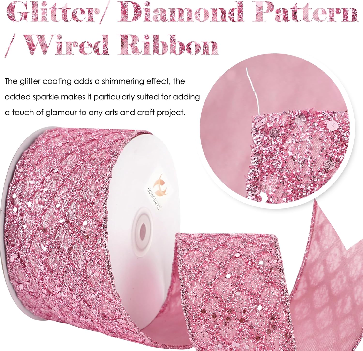 - Color: Pink glitter wired ribbon brings a bright and beautiful sparkly touchness to your decoration craft ideas and holiday gift wrapping, especially for Christmas tree decorations