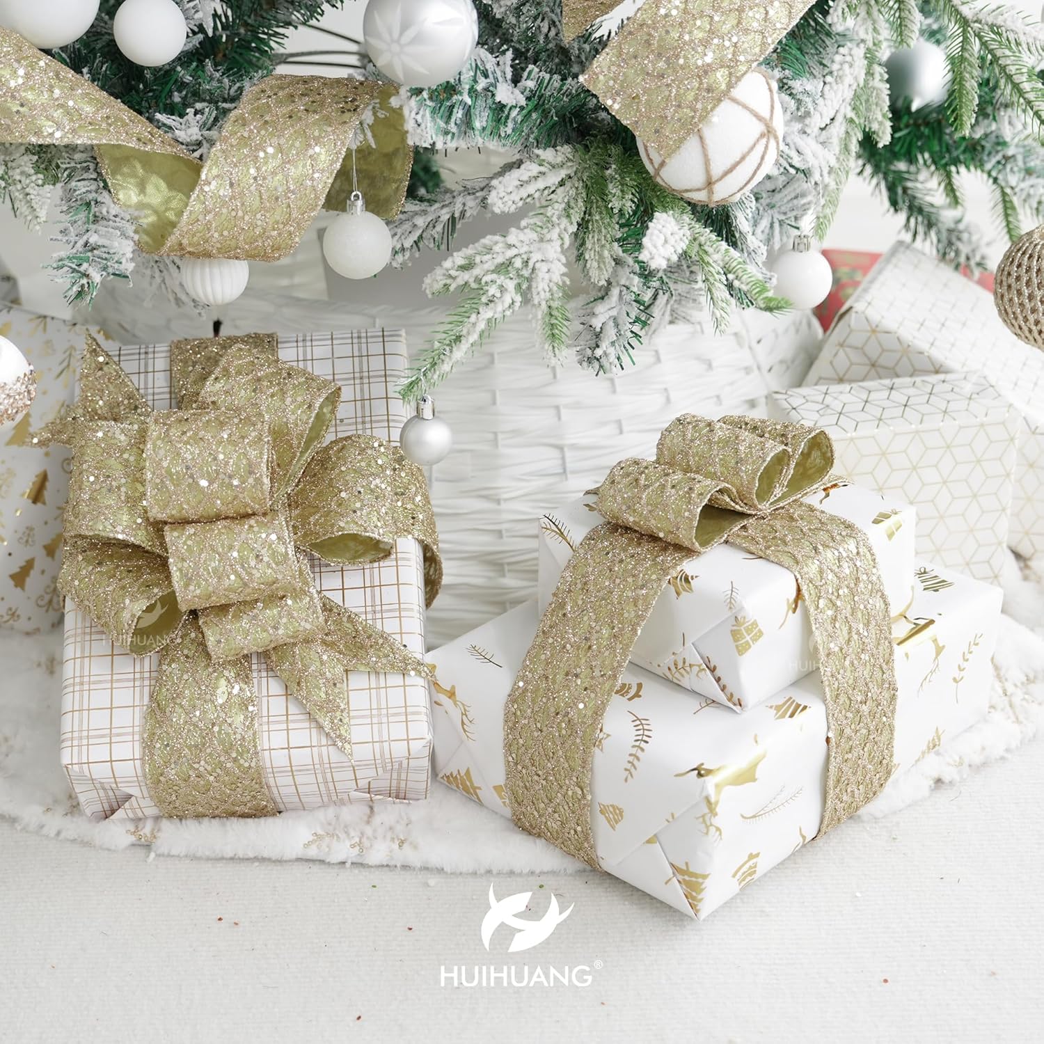 - Color: Champagne gold glitter wired ribbon brings a bright and beautiful sparkly touchness to your decoration craft ideas and holiday gift wrapping, especially for Christmas tree decorations