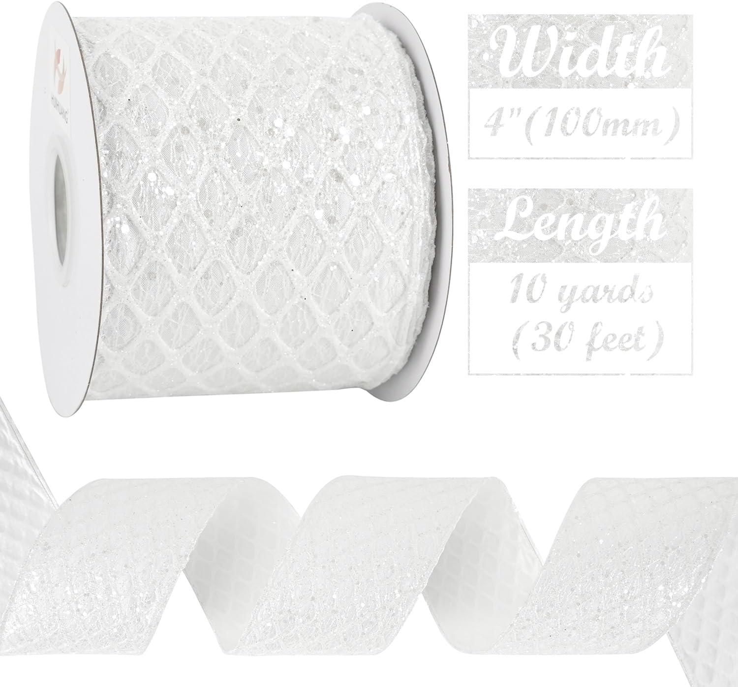 HUIHUANG White Glitter Wired Ribbon, 4 Inch x 30 Ft, Geometric Pattern, Polyester Material, Christmas Occasion