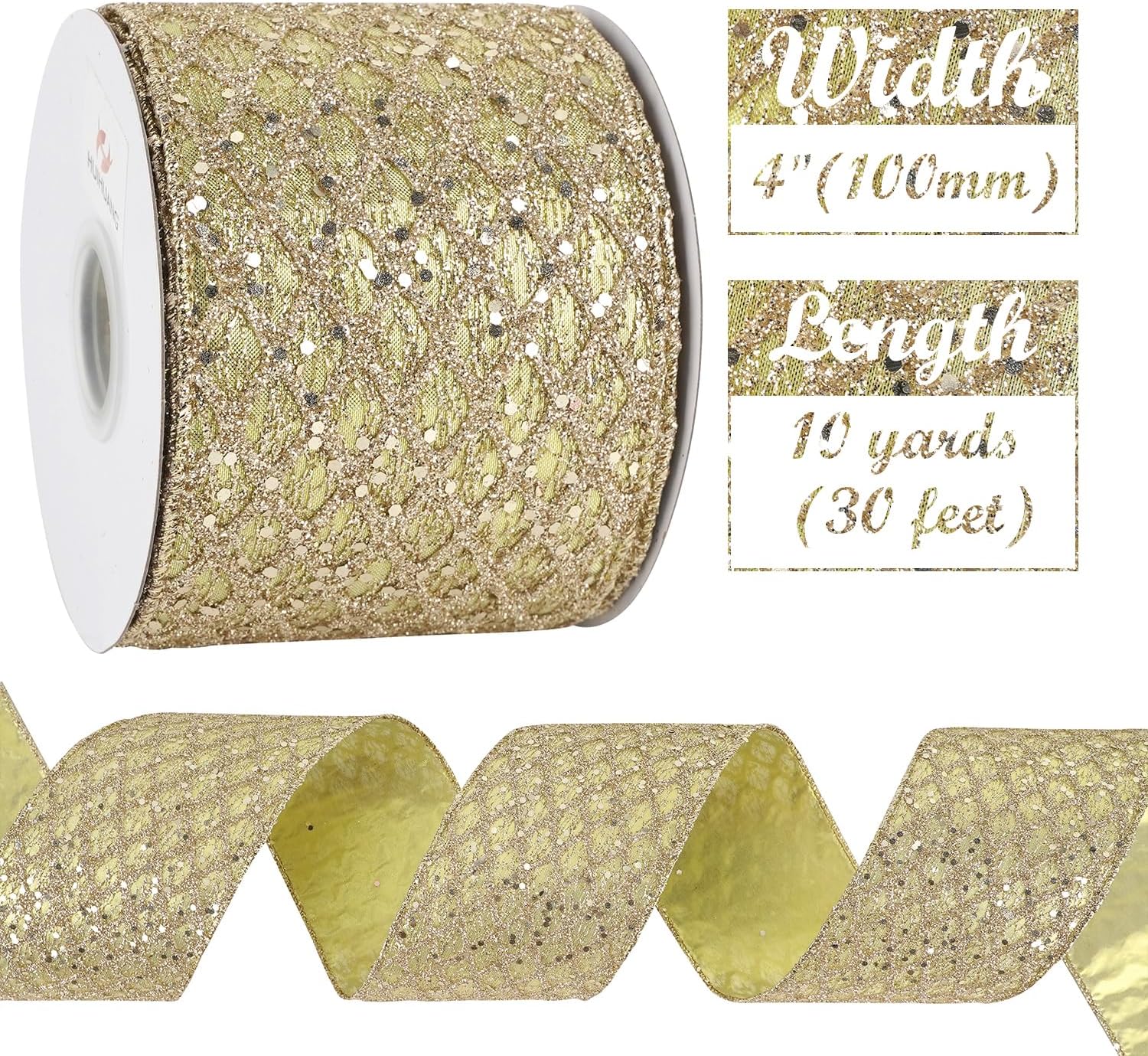 HUIHUANG Champagne Gold Christmas Ribbon 4 inch Glitter Wired Ribbon Diamond Mesh Wire Ribbon for X-mas Tree Decorations, Wreaths, Garland, Large Bows Making, Wedding Decor -10 Yards