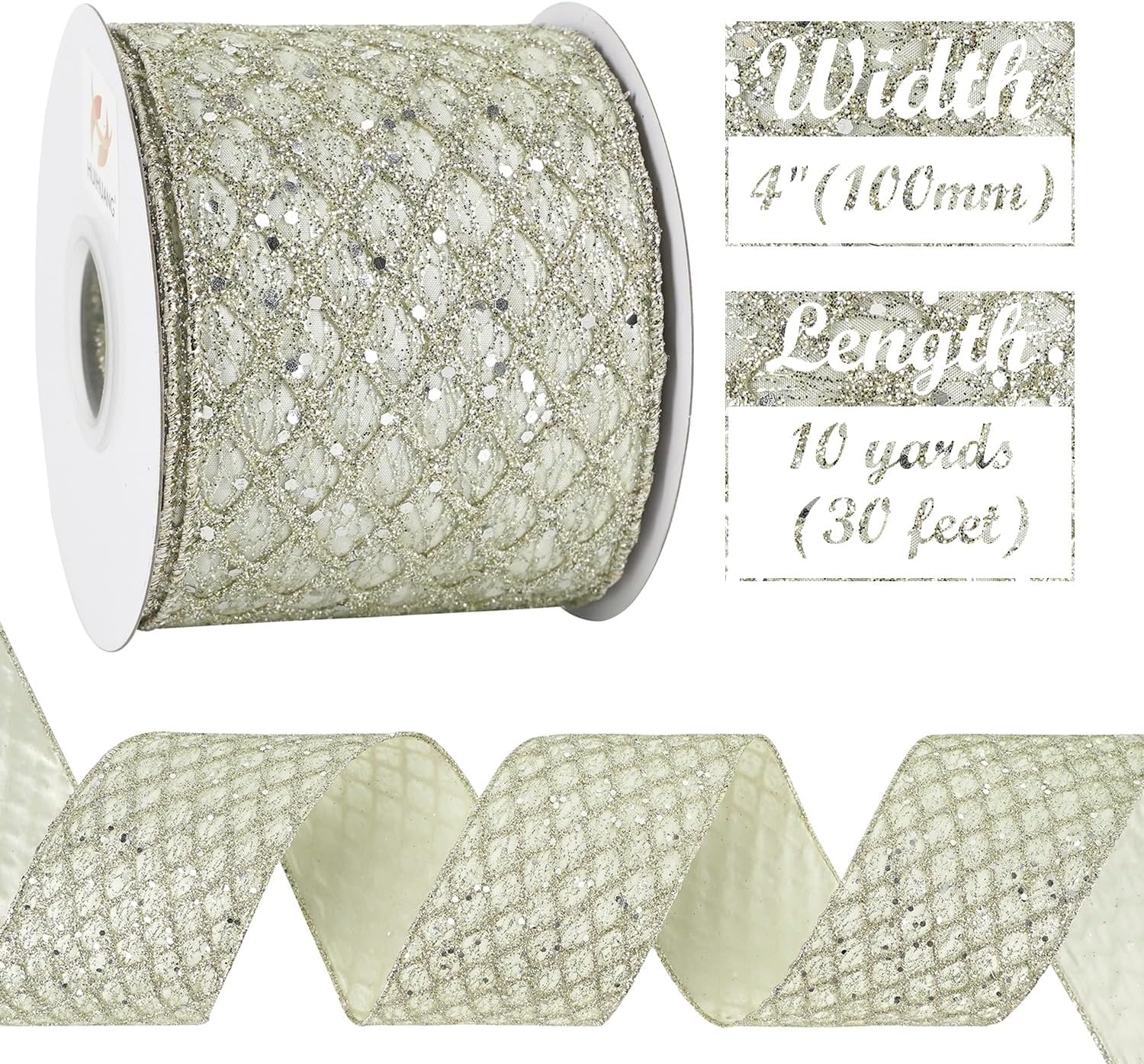 HUIHUANG Champagne Wired Ribbon 4 inch Glitter Christmas Tree Ribbon Diamond Mesh Wire Ribbon for X-mas Tree Decorations, Wreaths, Garland, Large Bows Making, Wedding Decor -10 Yards