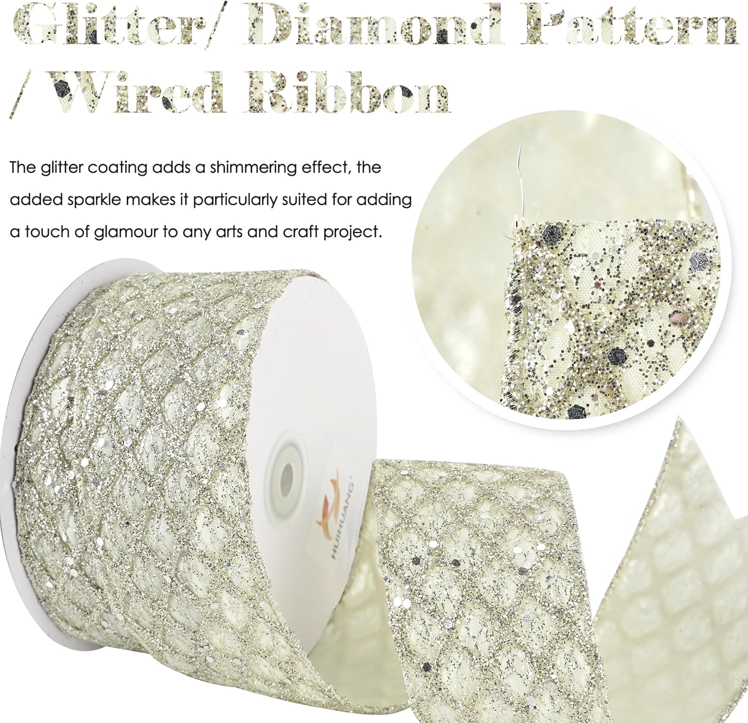 - Size and Package: This wired ribbon measures 2-1/2" wide and 10 yards(30 feet ) continuous long each roll, and the glitter diamond-shaped pattern on the wired ribbon adds a shiny and geometric element to Christmas decorations